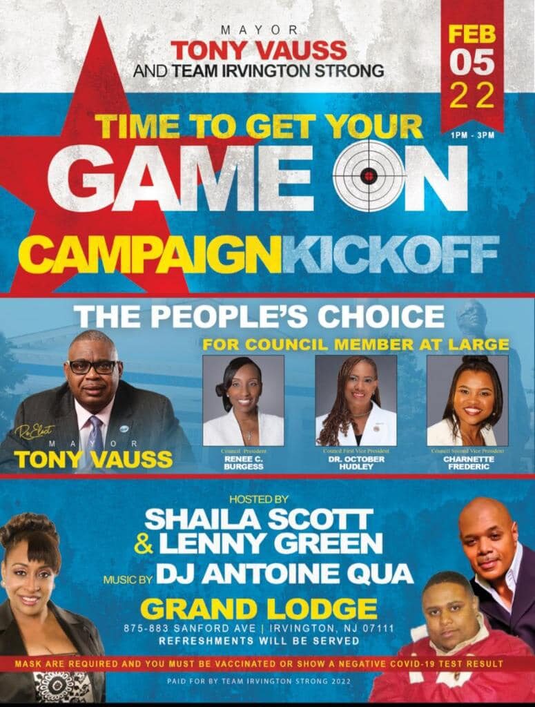 Haitian community leaders and elected officials will come together to celebrate the campaign Kick-off of Mayor Tony Vauss, Renee C. Burgess, Dr. October Hudley, and Charnette Frederic and announce their official endorsement of Team Irvington Strong on February 5, 2022.
