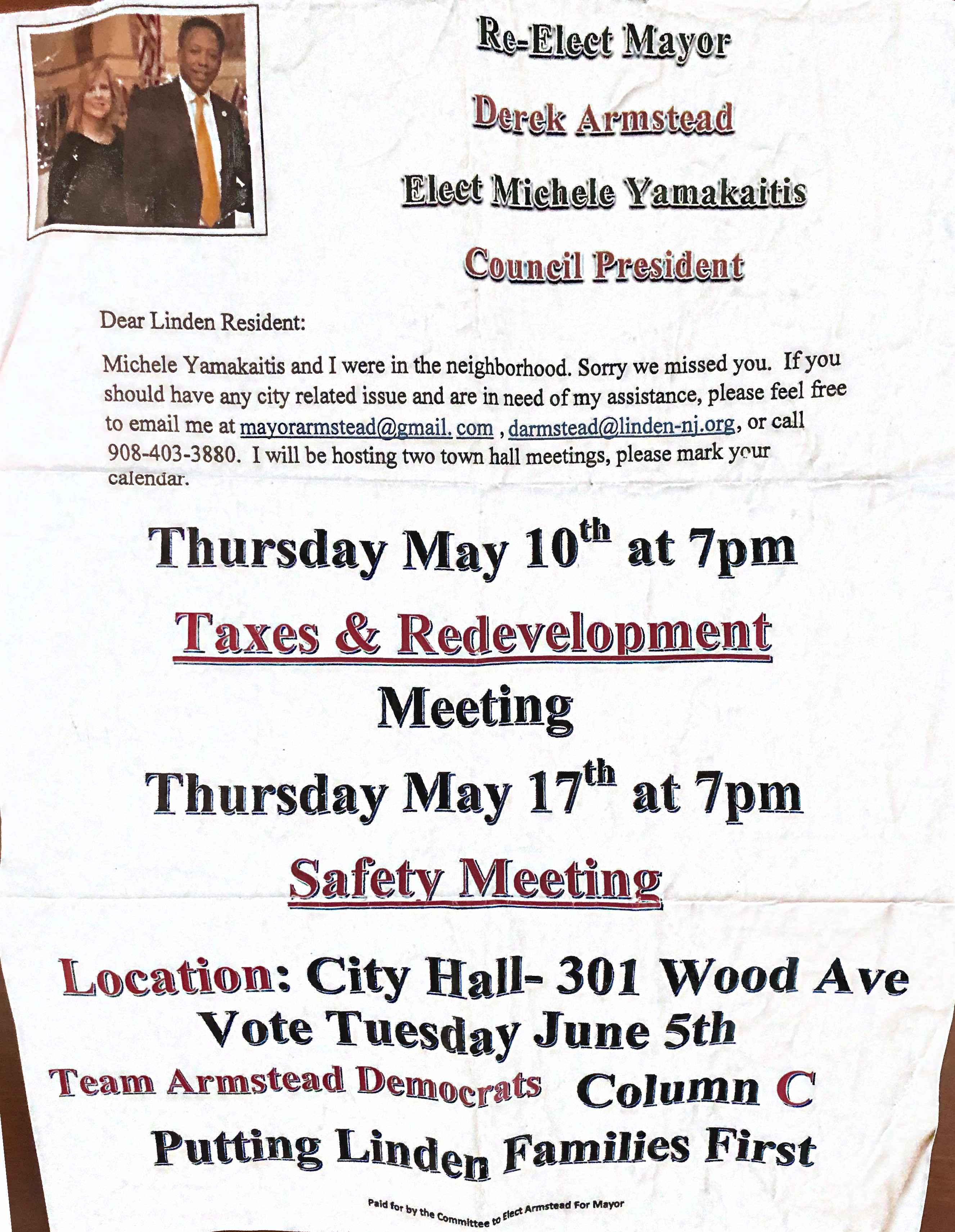 A flyer advertising the “town hall” (attached) specifies the meeting location as City Hall, while clearly declaring at the bottom “Paid for by the Committee to Elect Armstead Mayor”. It even includes the Mayor’s campaign slogans and themes. “This is blatant abuse but we shouldn’t be surprised,” Vasquez stated. “What should be a legitimate town hall for Linden residents to express their growing displeasure over the Mayor’s personal use of city vehicles, the lack of a plan to fill the vacancies on Wood Avenue, or the poor condition of Linden Train Station, has been replaced by a thinly veiled and invite-only campaign rally to be held in the taxpayers’ Council Chambers.”