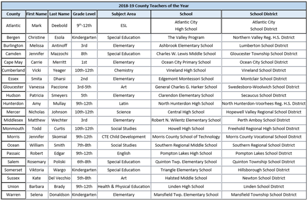“I am honored to recognize the 2018-2019 County Teachers of the Year,” said Governor Phil Murphy. “These 21 educators exemplify the outstanding level of talent and commitment that exists in New Jersey’s public schools. Their hard work and dedication is a critical part of making our state’s public education system one of the best in the country and creating a life-long love of learning for New Jersey’s students.”