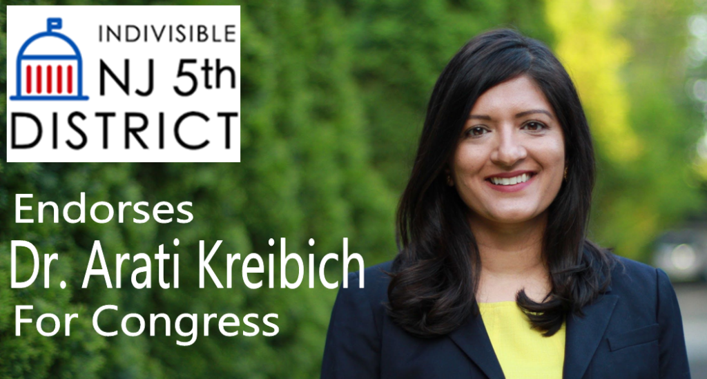Dr. Kreibich was selected for endorsement by Indivisible NJ 5th District after she and Rep. Gottheimer were sent detailed questionnaires to determine their positions on a range of issues. Their submissions were distributed to the membership who voted on endorsement. Arati secured over 89% of the votes. “Clearly our membership recognized that Arati would represent the needs of the entire NJ-5 population without being beholden to high dollar funders,” stated Marinus ‘Han’ Broekman. “As a scientist, she will look at the facts, and stand up for both the present economic needs and the future health of our community and beyond. Indivisible NJ 5th District is proud to endorse Dr. Arati Kreibich for Congress.”