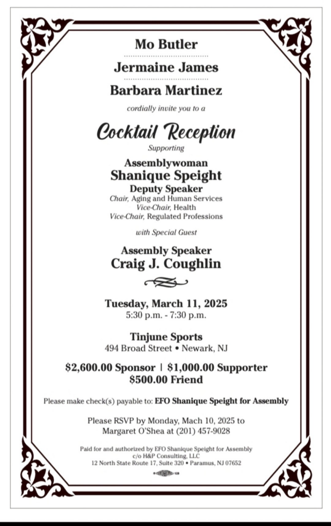 Please join Mo Butler, Jermaine James, and Barbara Martinez in supporting Deputy Speaker New Jersey Assemblywoman Shanique Speight with Special Guest Assembly Speaker Craig Coughlin. Assemblywoman Shanique Speight is a leading voice in Trenton focusing on key issues important to the 29th Legislative District. Assemblywoman Speight always ensures she brings the proper resources back to her constituents.