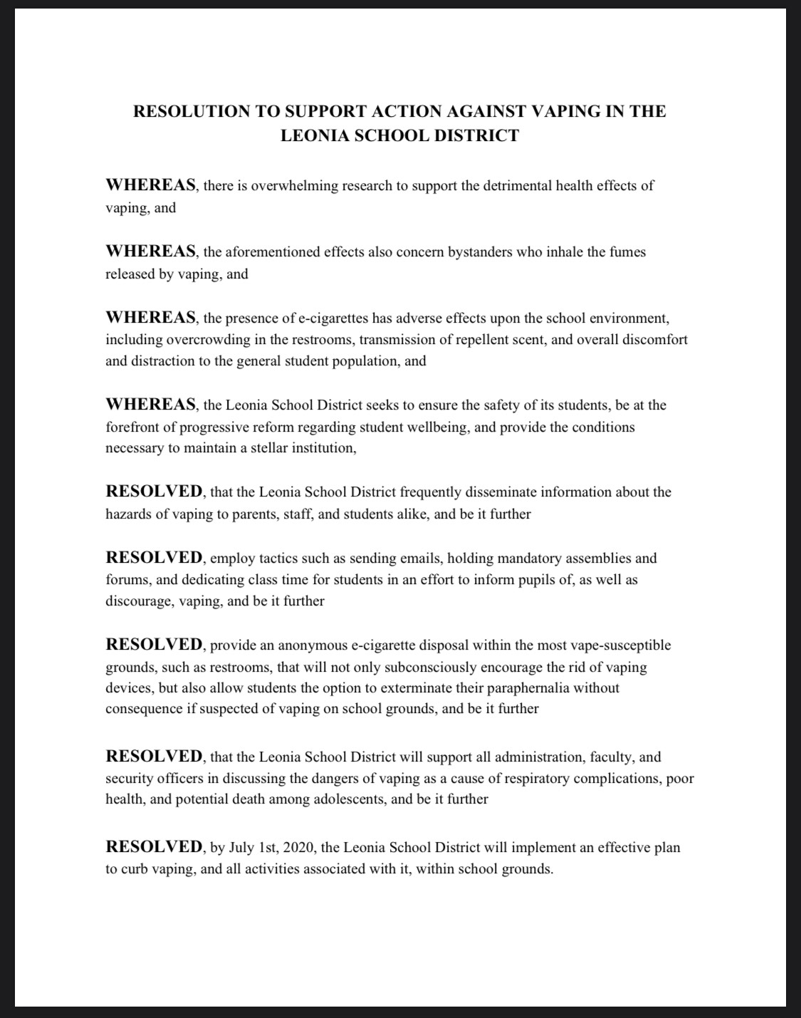 Regarding the student's resolution, Superintendent Dr. Edward Bertolini said, "We are proud of the leadership of our Student Representatives on the Board of Education. The Leonia School District is attempting to be proactive in reducing vaping by our students."