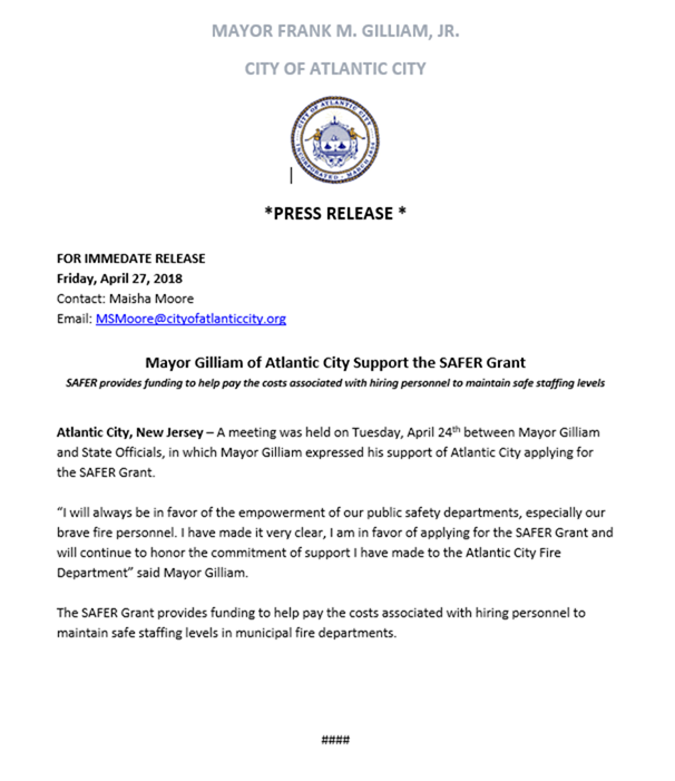 Mayor Gilliam of Atlantic City Supports the SAFER Grant