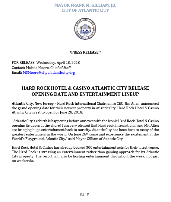 Mayor Gilliam - Hard Rock Hotel & Casino Opening Date