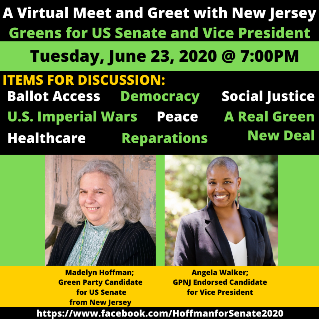 Madelyn Hoffman, the 2020 Green Party of NJ candidate for US Senate says: "I am really excited about this upcoming dialogue between my campaign for US Senate in NJ and Angela Walker, VP candidate with the Howie Hawkins campaign. We both care about many of the same issues, from a workers' bill of rights, to a real green new deal, to the growing Black Lives Matter movement and LGBTQI rights, just to name a few. We understand how challenging and how important it is to show how all these issues are interconnected. Angela Walker's insights and energy inspire me and my campaign, so I am looking forward to our conversation about why it is important for NJ voters to help us both get on the ballot in November. This live-streamed conversation will also show why we will make a good team."