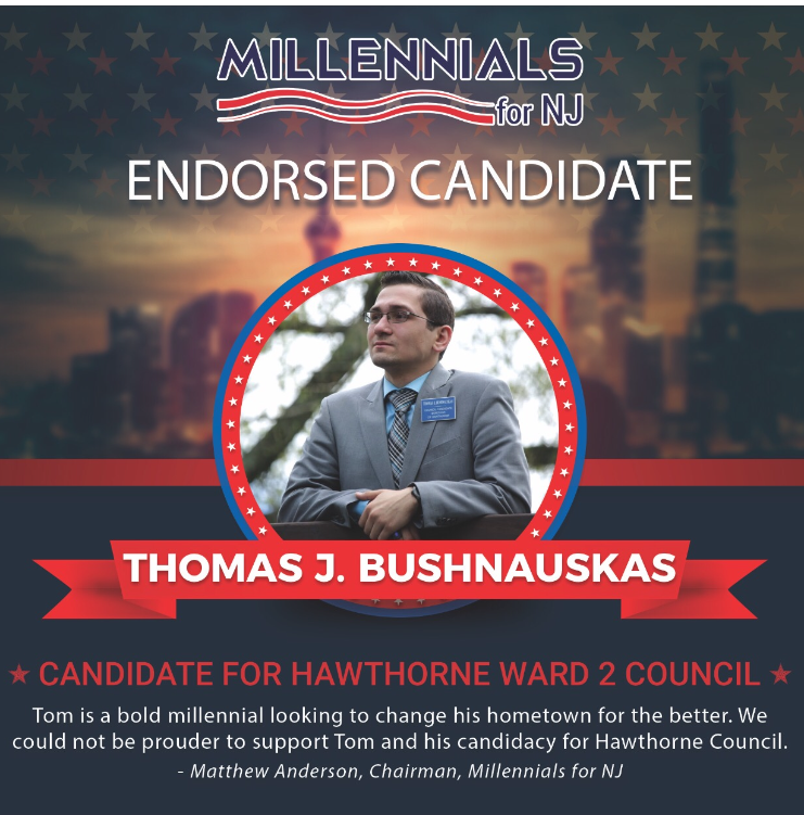 Bushnauskas, in response to his endorsement states, “I thank the Millennials for New Jersey as well as Matt Anderson for their endorsement. I am honored to be recognized by my peers and I am grateful for this endorsement. This endorsement means a great deal to me and to the people of my Ward. “