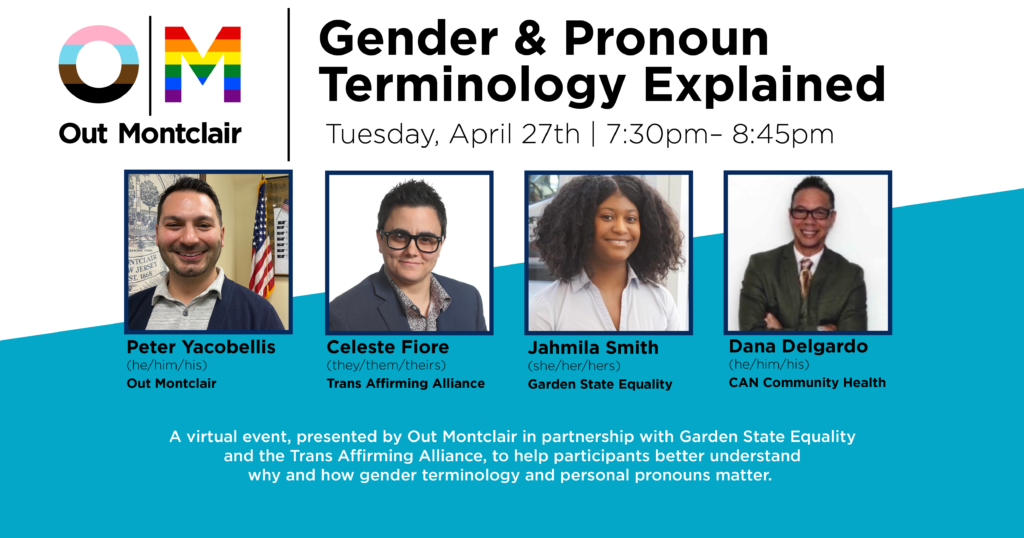 The event takes place on Tuesday, April 27th at 7:30pm and is open to anyone. You can Register Here: https://outmontclair.org/events/gender-and-pronoun-terminology-explained. (Zoom link sent out to registrants)