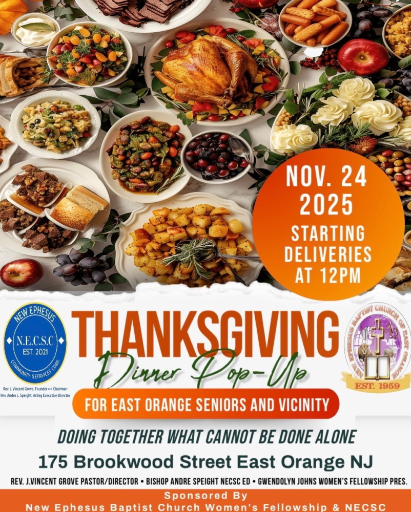 East Orange, NJ — New Ephesus Baptist Church Women’s Fellowship and the New Ephesus Community Services Corp. (NECSC) are proud to announce their annual Thanksgiving Dinner Pop-Up, dedicated to serving seniors and residents throughout East Orange and nearby communities. This year’s meal distribution will take place on November 24, 2025, with deliveries beginning at 12:00 PM.