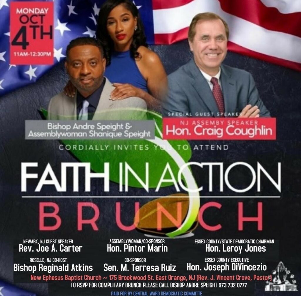 Bishop Andre Speight and the Honorable New Jersey Assemblywoman Shanique Speight invite you to our Faith in Action Brunch. It will take place Monday, October 4th, 2021 at New Ephesus Baptist Church at 175 Brookwood Street in East Orange, New Jersey.