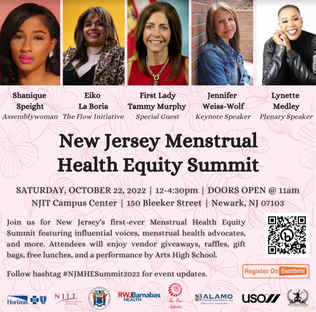 Please join New Jersey Assemblywoman Shanique Speight and Eiko La Boria Founder of the Flow Initiative for New Jersey's first ever Menstrual Health Equity Summit this Saturday October 22nd, 2022 from 12pm to 4pm.