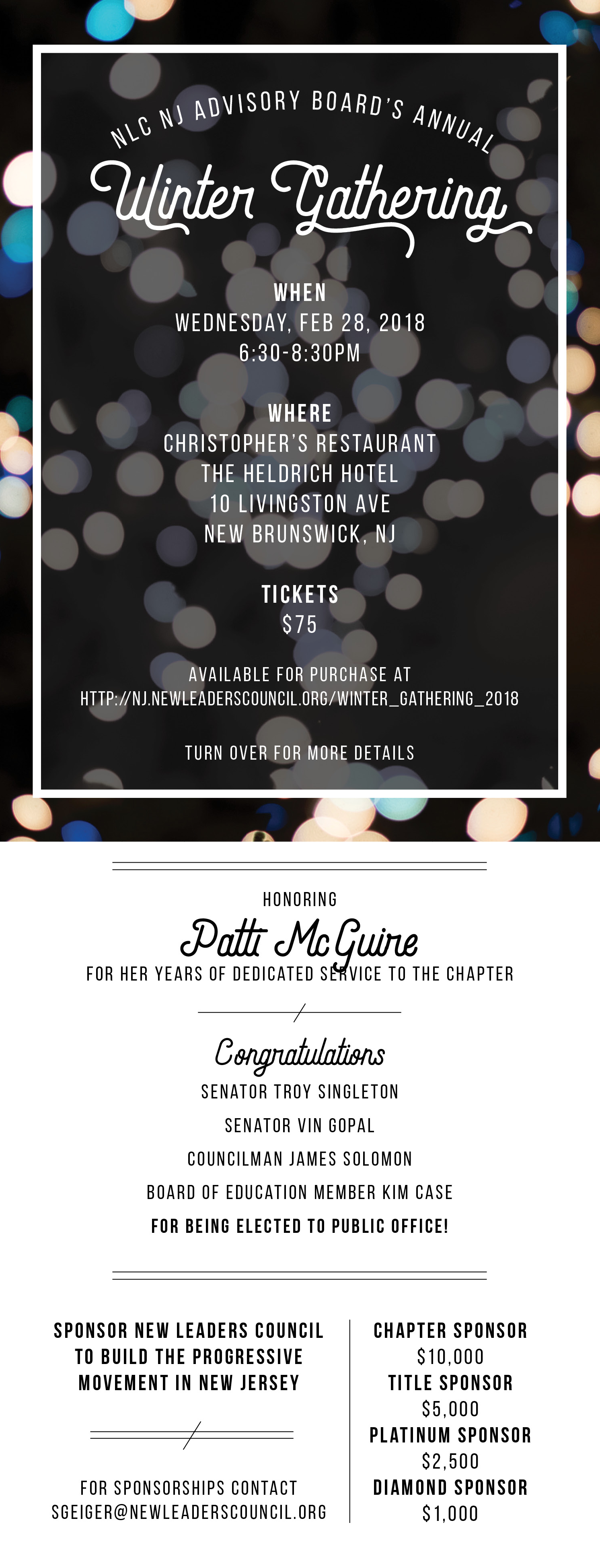 This year’s Winter Gathering, we will be celebrating members of the NLC NJ community who have been newly elected to public office last fall: Senator Troy Singleton (Honorary Co-Chair, NLC NJ), Senator Vin Gopal (NLC NJ Advisory Board member), Jersey City Councilman James Solomon (NLC 2015 Fellow), and Long Hill Township School Board Member, Kim Case (NLC 2012 Fellow).