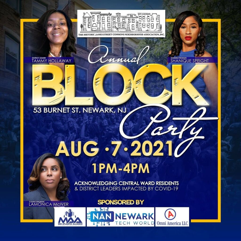 Newark Central Ward District Leader and President of The Historic James Street Commons Neighborhood Association Tammy Hollaway will host a Block Party to acknowledge Central Ward residents and District Leaders impacted by COVID-19. The Block Party will take place Saturday August 7, 2021 beginning at 1pm until 4pm. Festivities will begin at 53 Burnet Street, Newark, NJ 07102.