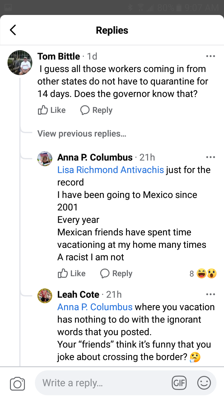 In a post in Facebook’s Branchburg Neighborhood Watch group, Columbus, commented on a post about power company workers from other states coming to assist with repairs from damage by Tropical Storm Isaias. One resident questioned whether workers needed to quarantine for 14 days and “Does the governor know that?”. Columbus responded, “they came through the Mexican border,” punctuated with a winking emoji face with a tongue sticking out. The remark has since been deleted.