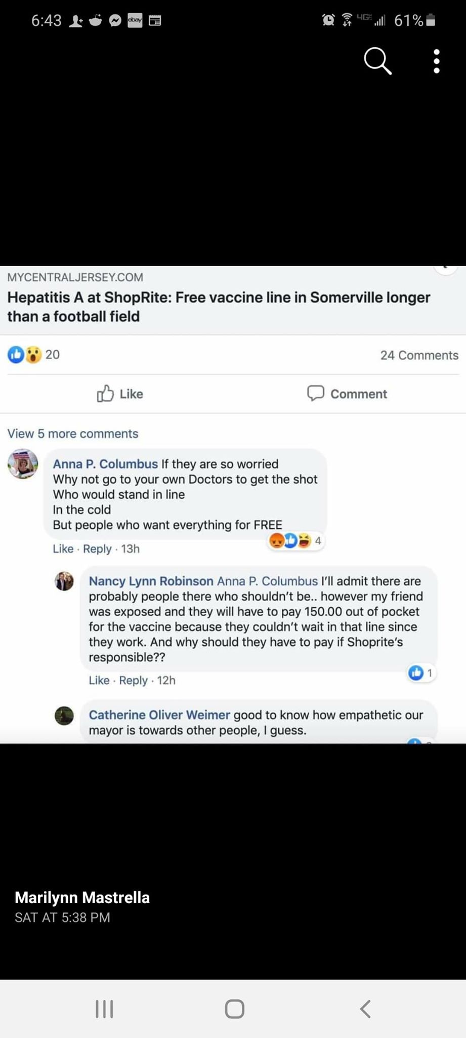 This is not the first time Columbus's social media posts have drawn controversy. In a Facebook post in November 2019, in response to a news article regarding lines at the Somerville Shoprite for a hepatitis A vaccine, Columbus commented, "If they are so worried Why not go to your own Doctors to get the shot Who would stand in line in the cold But people who want everything for FREE."