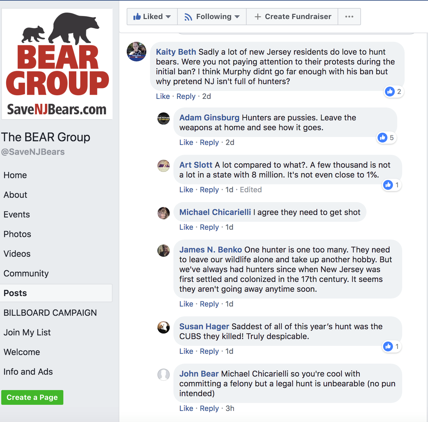 Threats included calls to "hunt the hunters" along with explicit details posted on the BEAR Group's page of "giving hunters a 30 minute head start" then "holding their ugly faces in the air with my steel toe boot stomped on their little necks" by a BEAR Group member with a handgun as her profile picture. The NJOA supports the Second Amendment and responsible, safe firearms ownership but strongly condemns threatening law-abiding citizens who have a net-positive impact on the environment, public safety and the economy.
