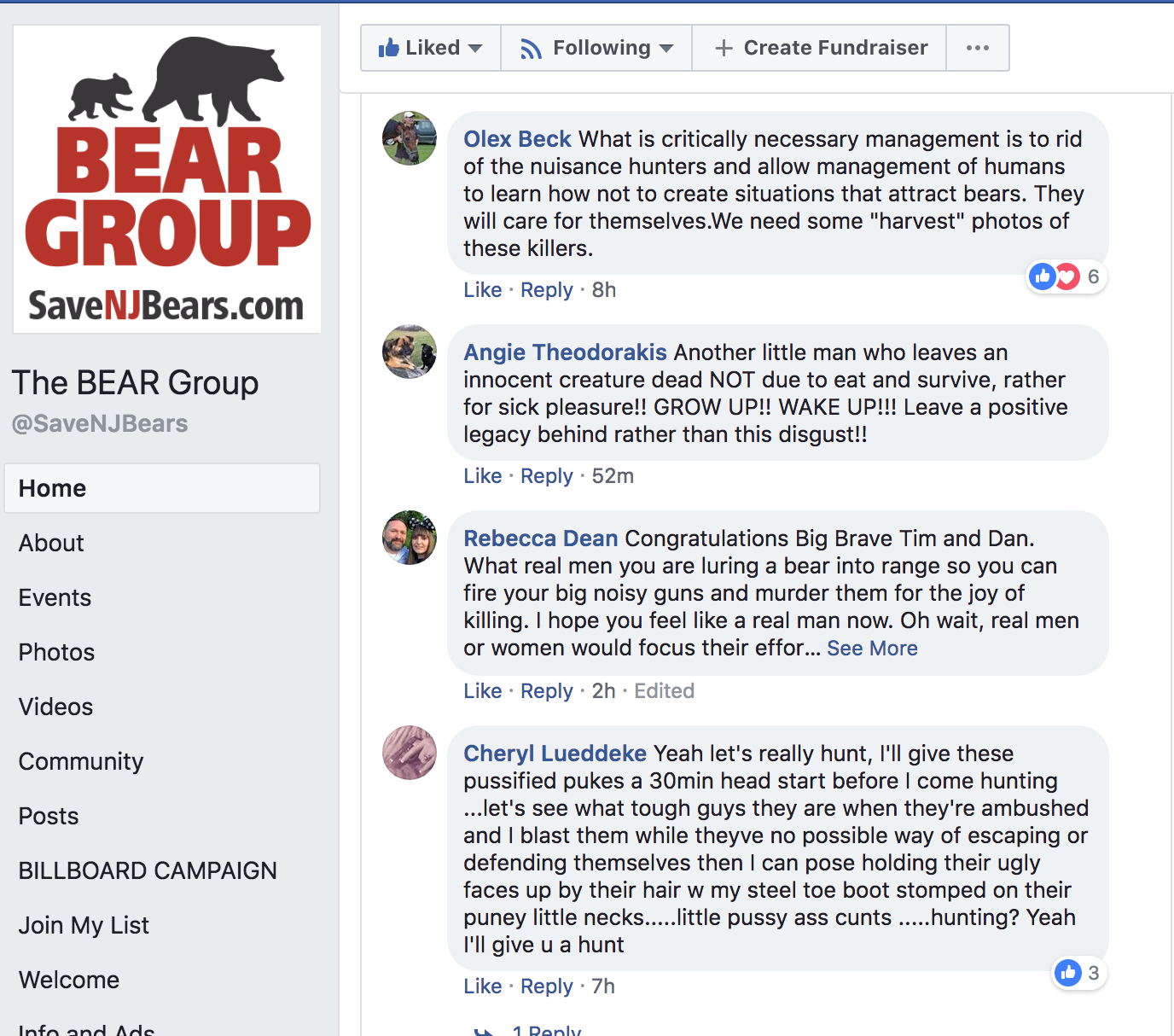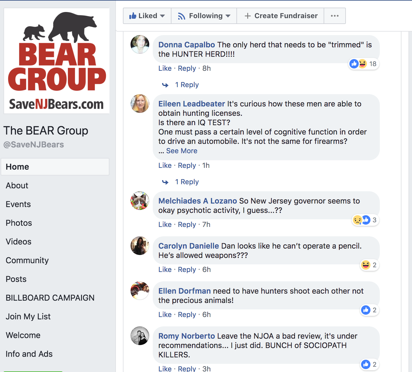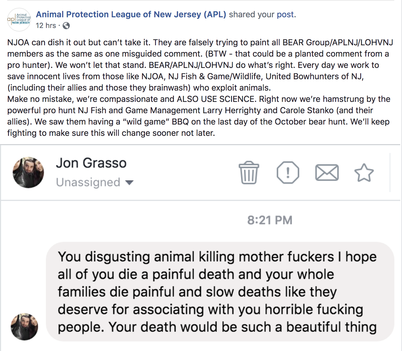 Threats included calls to "hunt the hunters" along with explicit details posted on the BEAR Group's page of "giving hunters a 30 minute head start" then "holding their ugly faces in the air with my steel toe boot stomped on their little necks" by a BEAR Group member with a handgun as her profile picture. The NJOA supports the Second Amendment and responsible, safe firearms ownership but strongly condemns threatening law-abiding citizens who have a net-positive impact on the environment, public safety and the economy.