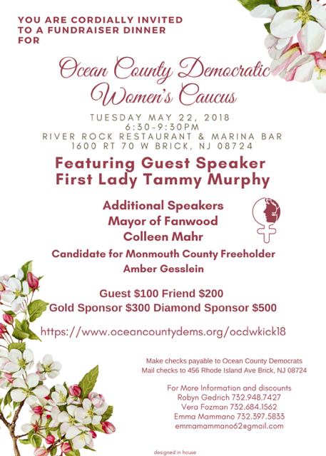 The fundraiser will be held on Tuesday, May 22nd at 6:30pm, at the River Rock Restaurant and Marina Bar, 1600 Route 70 in Brick. Tickets for this special event are limited, so if you’d like to attend, buy your ticket now by using the following link: https://www.oceancountydems.org/ocdwkick18.