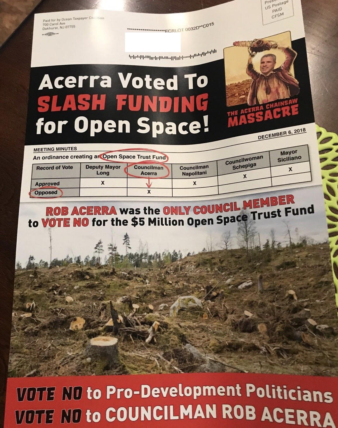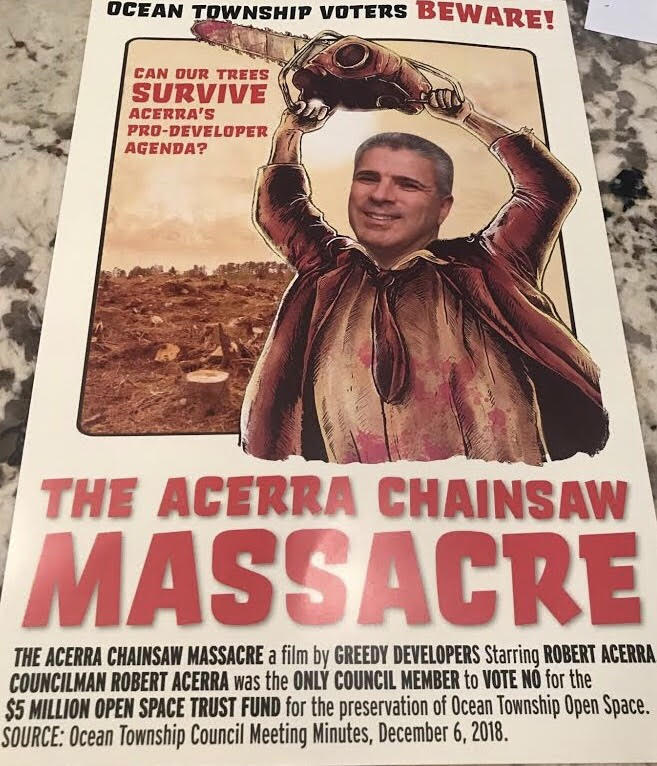 "Following a weekend which saw incumbent Ocean Township Mayor Chris Siciliano threaten physical violence against a young constituent, Ocean Township politics hit another new low this week, with the widespread dissemination of an anonymous mailer depicting Councilman Rob Acerra as a blood-stained mass-murdering serial killer in a piece spoofing the Texas Chainsaw Massacre. This disturbing mail-piece is paid for by an anonymous group called “Ocean Taxpayers’ Coalition.” The group’s funding sources are unknown, given that they appear to be unregistered with the New Jersey Election Law Enforcement Commission.