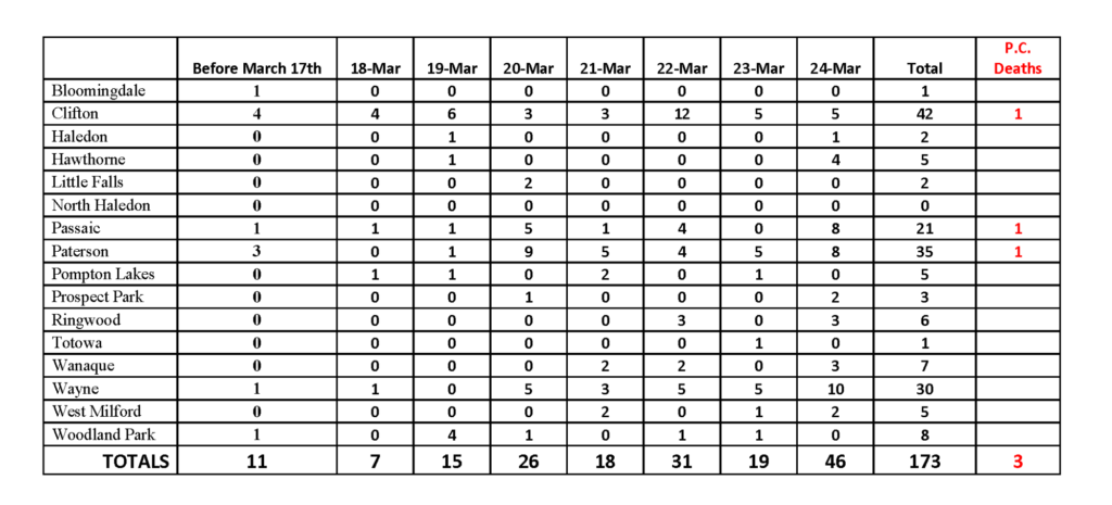 (As of Tuesday March 24 afternoon, the NJDOH cites 216 COVID-19 cases in Passaic County)