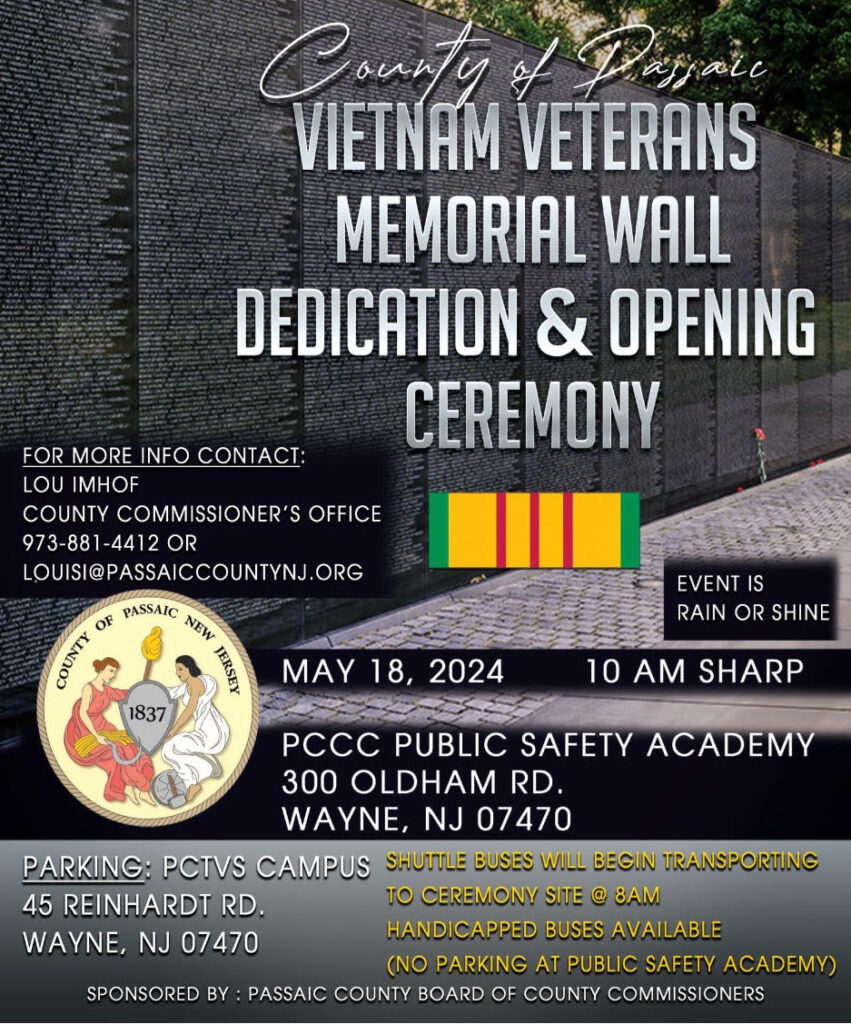 Wayne, New Jersey - On Saturday, May 18th, 2024, Passaic County will hold a dedication and unveiling ceremony for the Vietnam Veterans Memorial Wall, honoring the over-58,000 lives lost in the Vietnam War, including 83 natives of Passaic County.