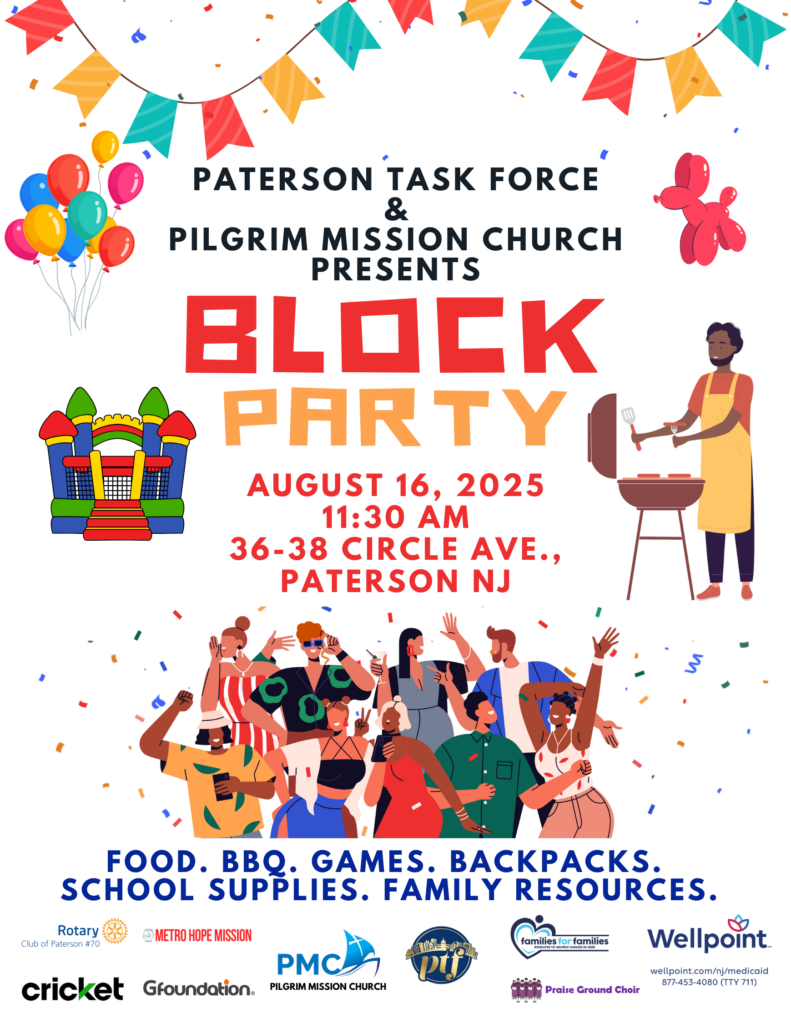 PATERSON, NJ — Paterson families are invited to a free Community Block Party on Saturday, August 16, 2025, hosted by Paterson Task Force and Pilgrim Mission Church, taking place outside Hilltop Haven, one of Paterson Task Force’s emergency shelters, located at 36–38 Circle Avenue. The event begins at 11:30 AM.