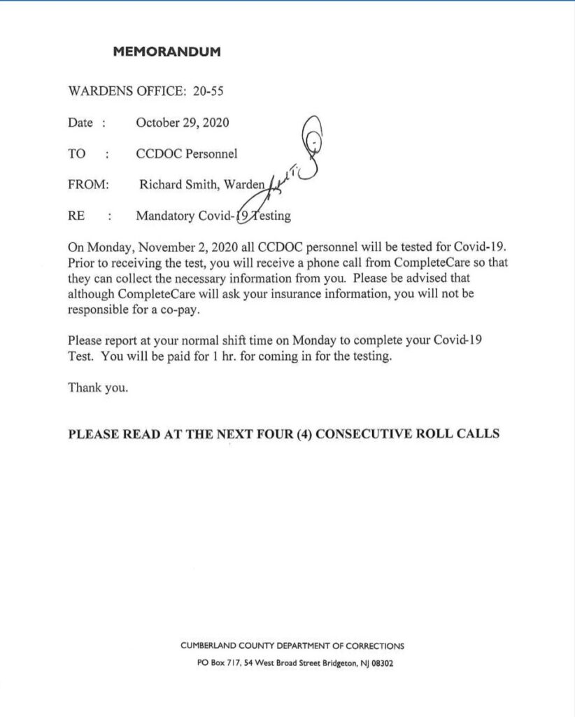 Warden Richard Smith and the County Board of Freeholders refused to adopt jail-wide Covid testing policies for inmates, officers, and staff. Instead, they waited nearly eight months to begin testing officers, according to an internal memo.