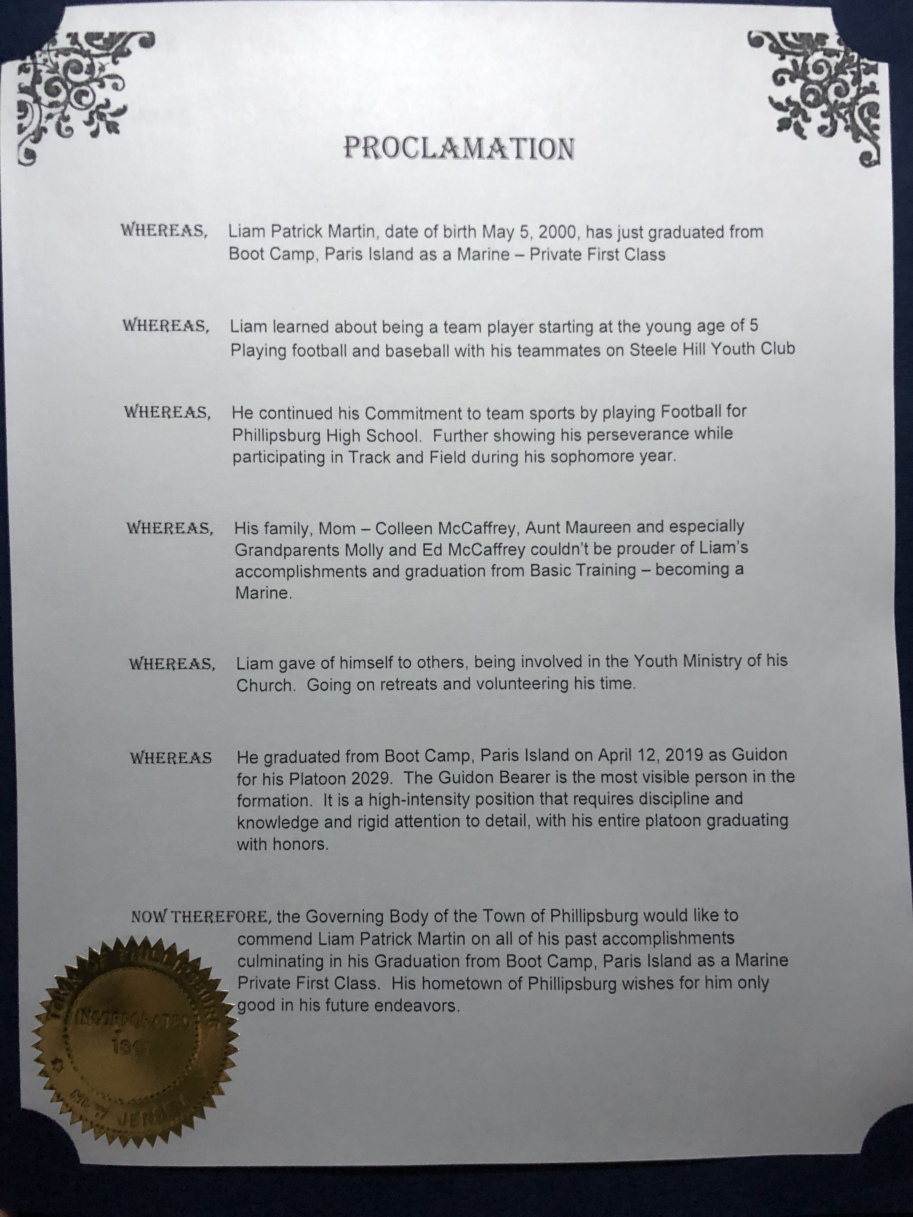 Council welcomed home newly graduated Marine, Private First Class, Liam Patrick Martin in the