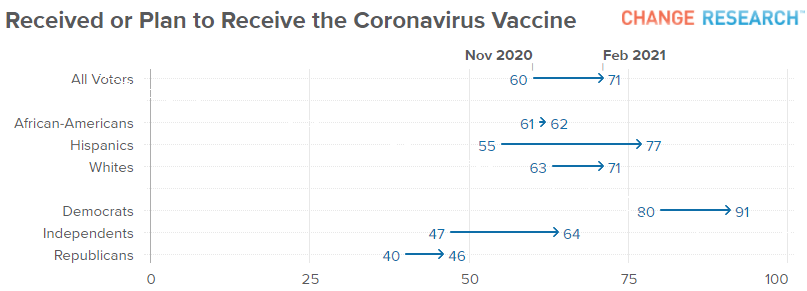 The largest gains in willingness to receive the vaccine came among Hispanic voters (55% to 77%) and Independent voters (47% to 64%), while there was almost no shift among Black voters (61% to 62%). A large partisan split remains, with fewer than half of Republican voters (46%) saying they would receive the vaccine compared to 91% of Democrats.