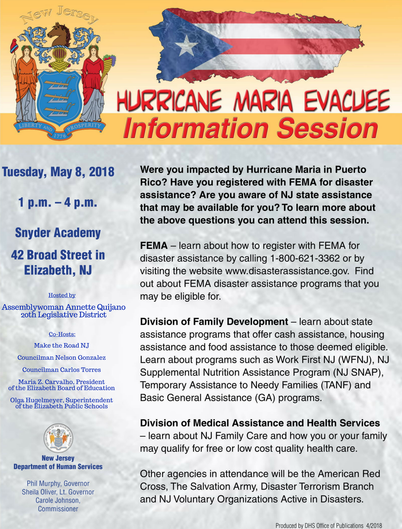 (TRENTON) – Assemblywoman Annette Quijano (D-Union) will host a Hurricane Maria Evacuee Information Session in Elizabeth on Tuesday, May 8 to assist Puerto Rican families who evacuated to New Jersey after Hurricane Maria devastated the island.