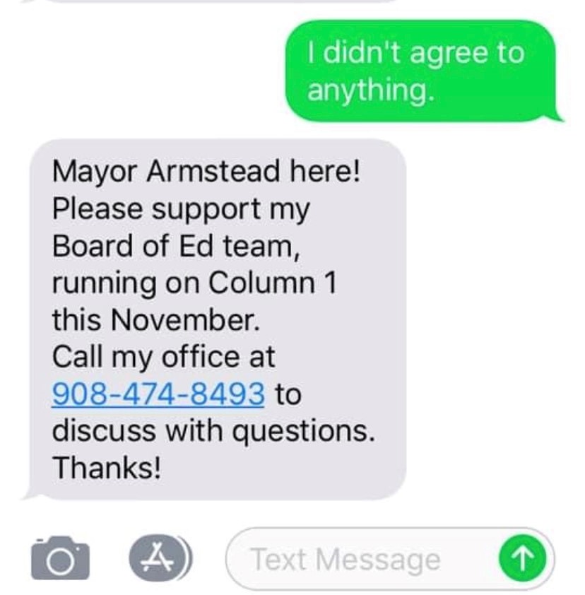 "Mayor Armstead here! Please support my Board of Ed team running on column 1 this November. Call my office at (908) 474-8493 to discuss with questions. Thanks."