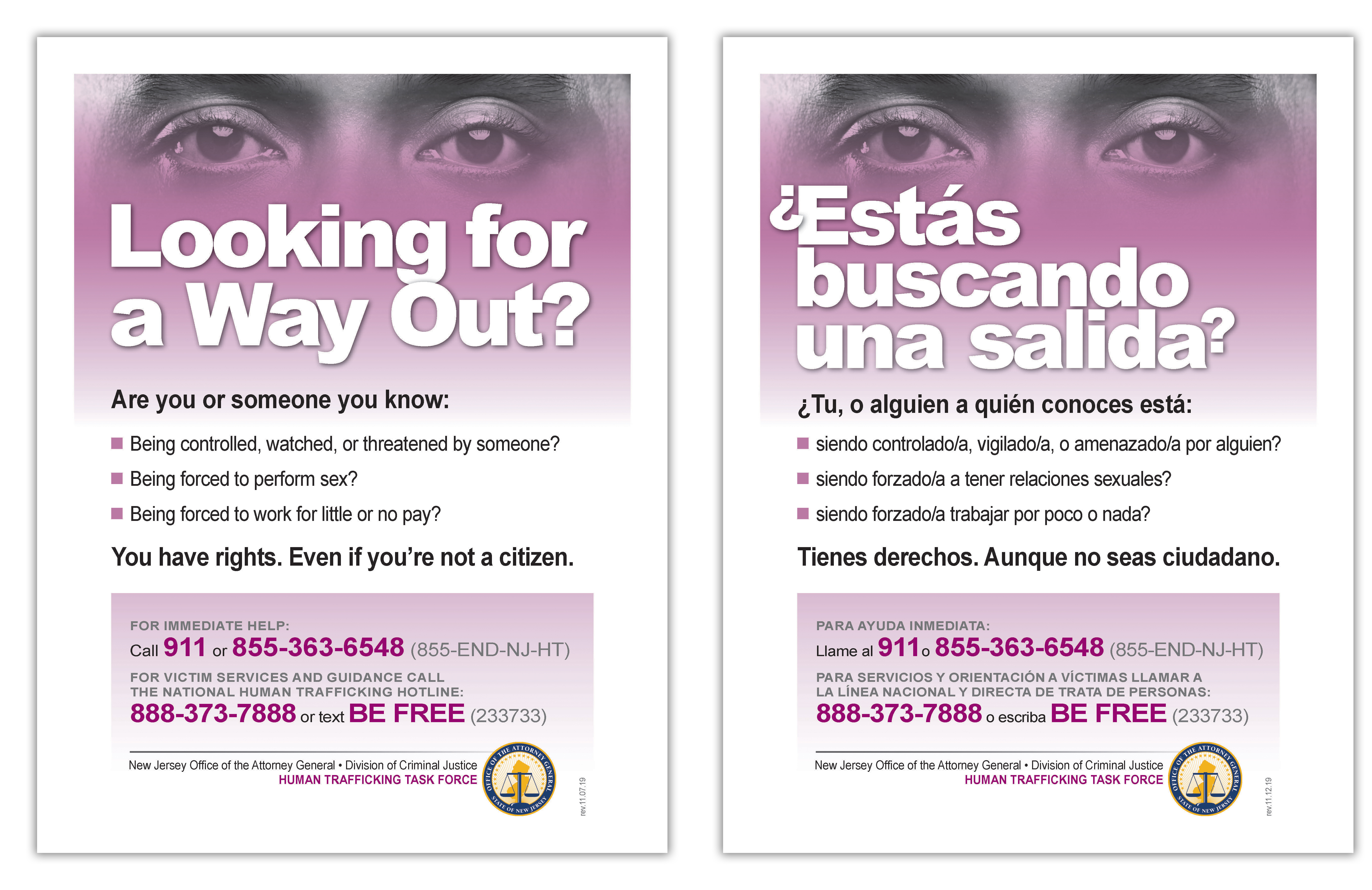 “These posters will be viewed by millions of people who pass through the rest stops along the New Jersey Turnpike and the Parkway each year. They are designed to speak directly to those who may be looking for a way out of a trafficking situation, as well as to those who may have witnessed any form of trafficking; for those who may need immediate emergency assistance, as well as those who need information or longer term support.” said Attorney General Gurbir S. Grewal. “I want to thank everyone who took part in the truly collaborative effort that will raise awareness and save lives.”