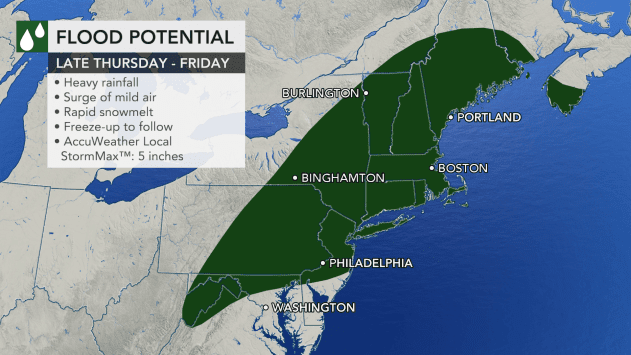 "The rapidly melting snow, which contains approximately 1-3 inches of water will combine with an anticipated 1-3 inches of rain and locally higher amounts from the storm from Christmas Eve to early Christmas Day," AccuWeather Senior Meteorologist Brett Anderson said.