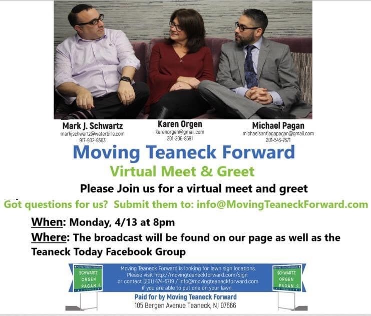 Teaneck, N.J. – The Moving Teaneck Forward slate which consists of Deputy Mayor Mark J. Schwartz and Planning Board Members Karen Lew Orgen and Michael Pagan will be holding a Virtual Meet & Greet tonight, Monday, April 13th at 8 p.m. on Zoom at https://zoom.us/j/2014745719 Residents can also see the forum on the #MovingTeaneckForward Facebook page and the #TeaneckToday Facebook group page.