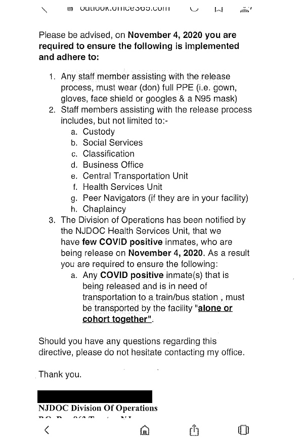 Further, it explains that the COVID-positive inmates who are being released must be transported from their prison facility to a train or bus station “alone or cohort[ed]” together, presumably to protect NJDOC staff or other inmates from exposure until they are released.