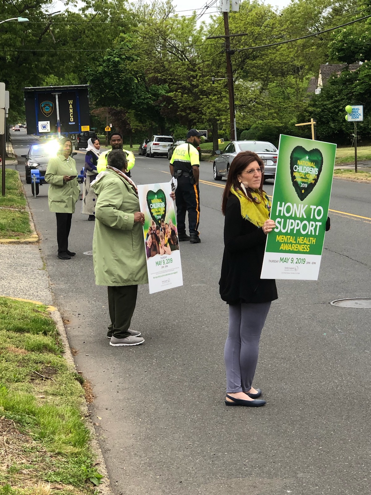 (MAY 10, 2019--PLAINFIELD, NJ)- The Family Support Organization (FSO) of Union County reached thousands of Plainfield commuters during the organization's successful "Honk for Children's Mental Health Awareness Day" on Thursday, May 9th. More than 5000 cars, trucks and school buses passed the outdoor event, and more than 1,000 of those drivers honked in support. Volunteers held colorful signage and cheered on drivers while the enthusiastic DJ Sienna made short PSA announcements over the loud speaker about the importance of mental health.