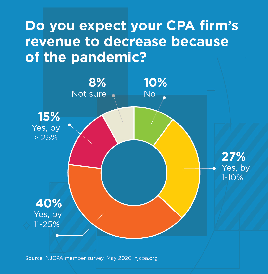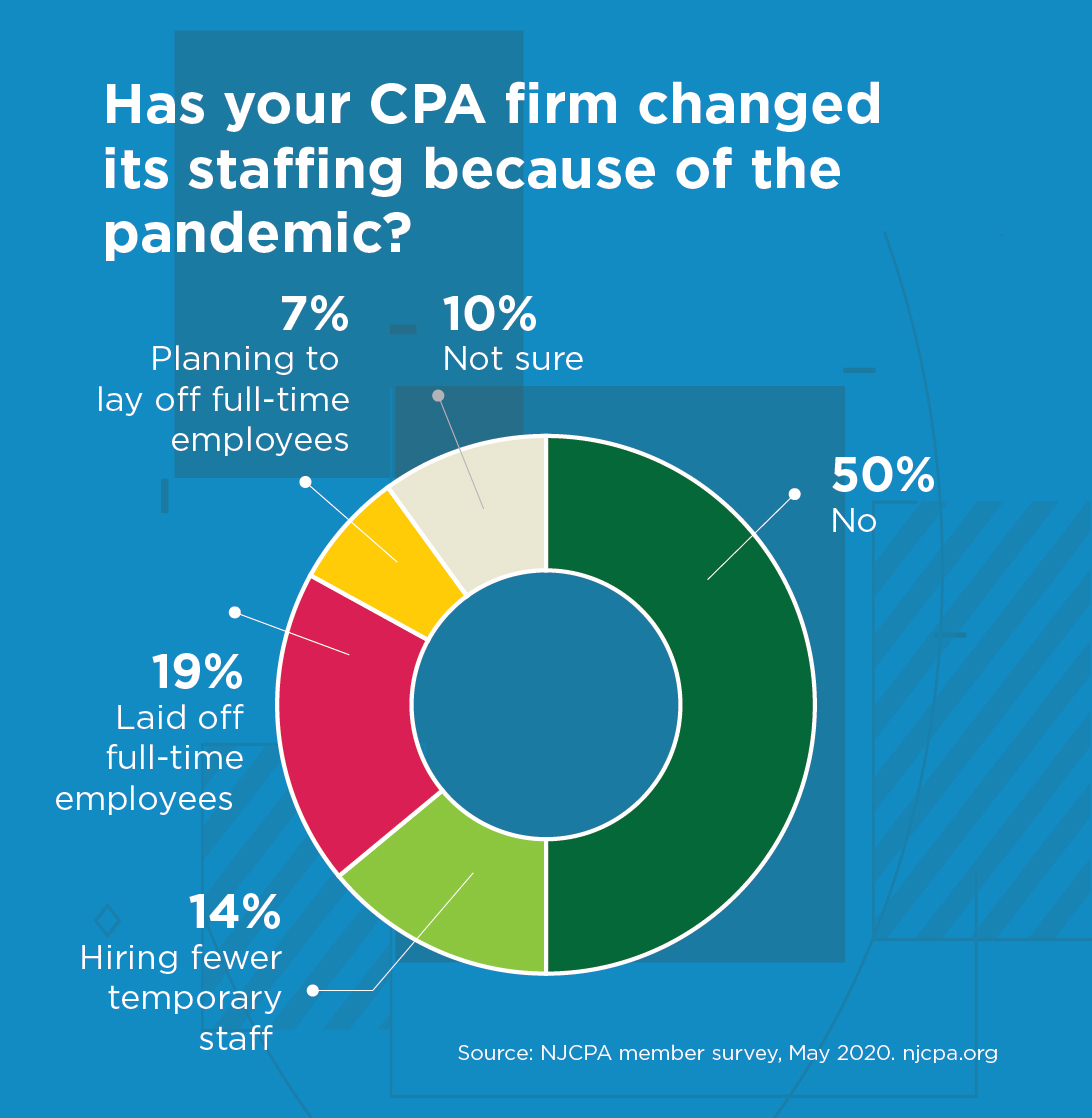 Accounting firms of all sizes share their clients concerns; 40 percent of survey participants indicated that they expect their firm’s revenue to decrease by 11-25 percent during the pandemic. However, New Jersey accounting firms remain committed to clients, with half of respondents indicating that their firms had so far made no changes to their staffing levels.
