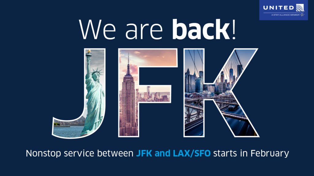 CHICAGO, November 10, 2020 – United Airlines announced today that it will be returning service to New York City’s John F. Kennedy Airport (JFK) on February 1, 2021 with nonstop service to the west coast. The airline’s entry back into JFK after five years reflects not only its strong commitment to the New York City area, but a continuation of aggressively and strategically managing the impact of COVID-19 by increasing service to and from the places where customers want to fly. The new United service will operate out of Terminal 7.