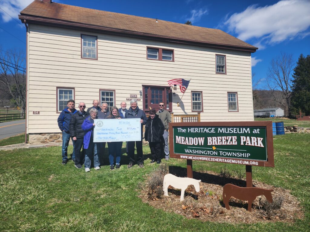 Commissioner Director Lori Ciesla (center) presents a ceremonial check for historic preservation at the Heritage Museum at Meadow Breeze Park to Washington Township officials. Also pictured are Mayor George Willan (second from the left), Deputy Mayor Ralph Fiore (far left), Chairman of the Washington Township Historical Preservation Commission Brian Wilcox (center right), Director of Land Preservation Corey Tierney (far right), and volunteers of the Heritage Museum at Meadow Breeze Park.