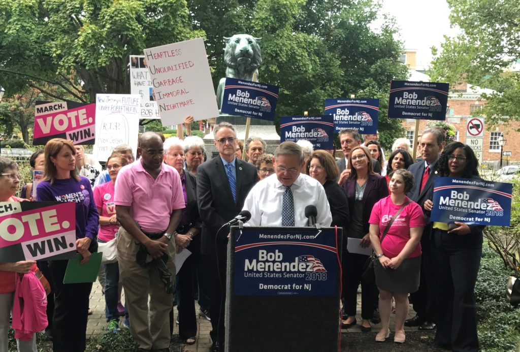 Menendez led a boisterous rally in front of the iconic Tiger statue in Palmer Square that denounced his Republican challenger for opposing the rights of women and gays.