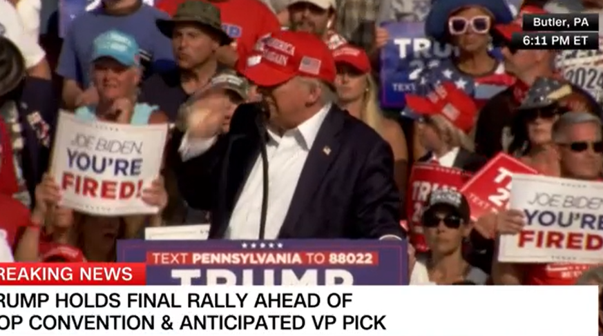Trump began his speech at about 6 p.m. and was only shortly into his speech when a disturbance caused Secret Service to swarm the former president. He was then led off the stage quickly, pumping his fist.