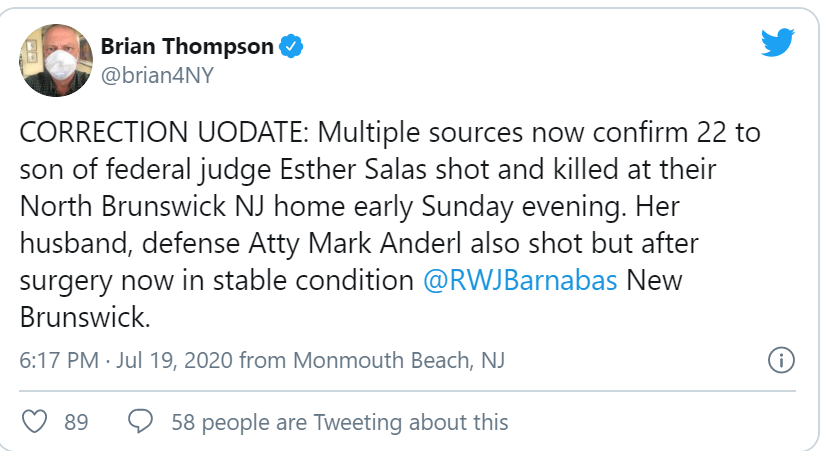 “I know Judge Salas and her husband well, and was proud to recommend her to President Obama for nomination to New Jersey’s federal bench. My prayers are with Judge Salas and her family, and that those responsible for this horrendous act are swiftly apprehended and brought to justice.”
