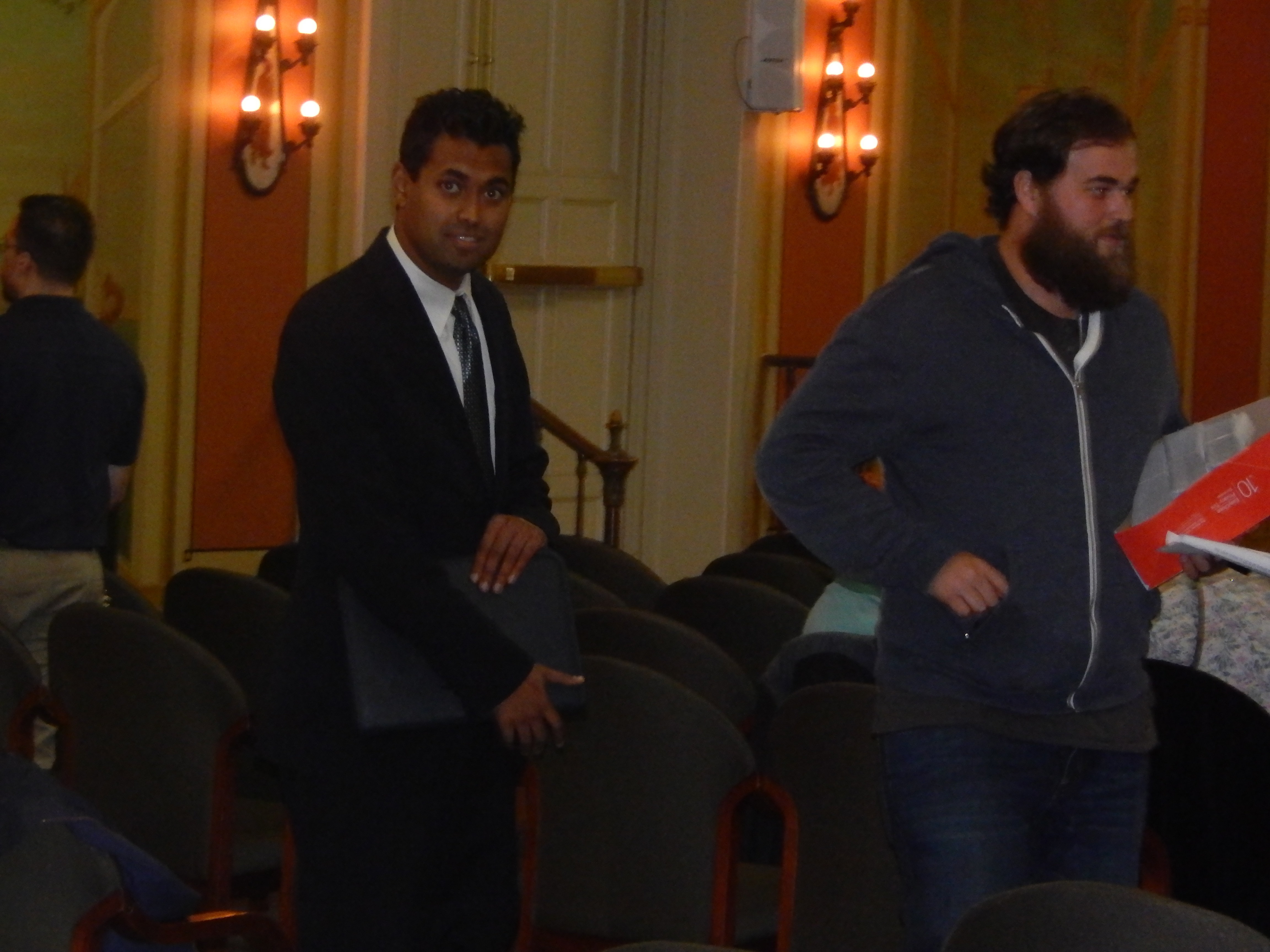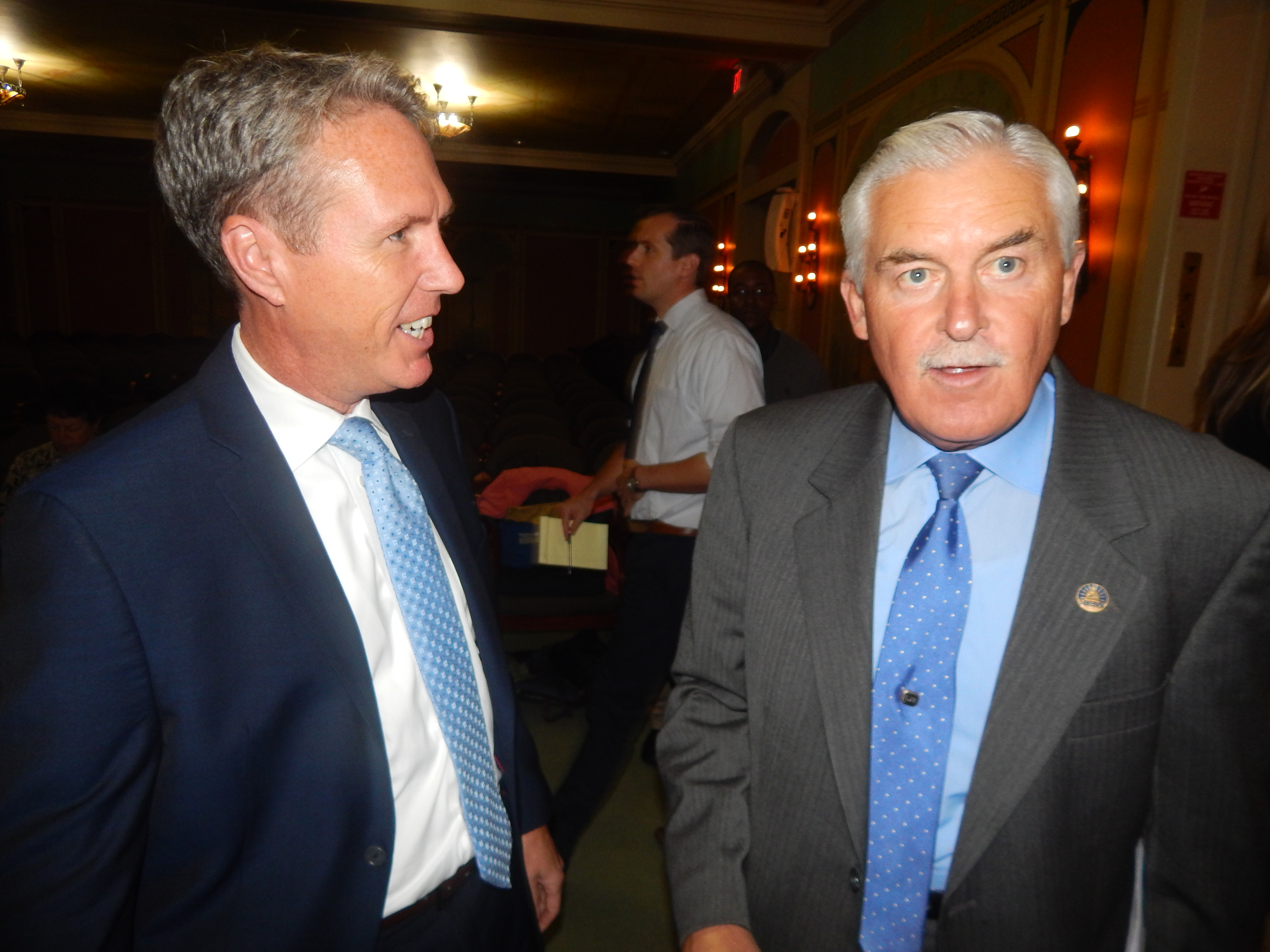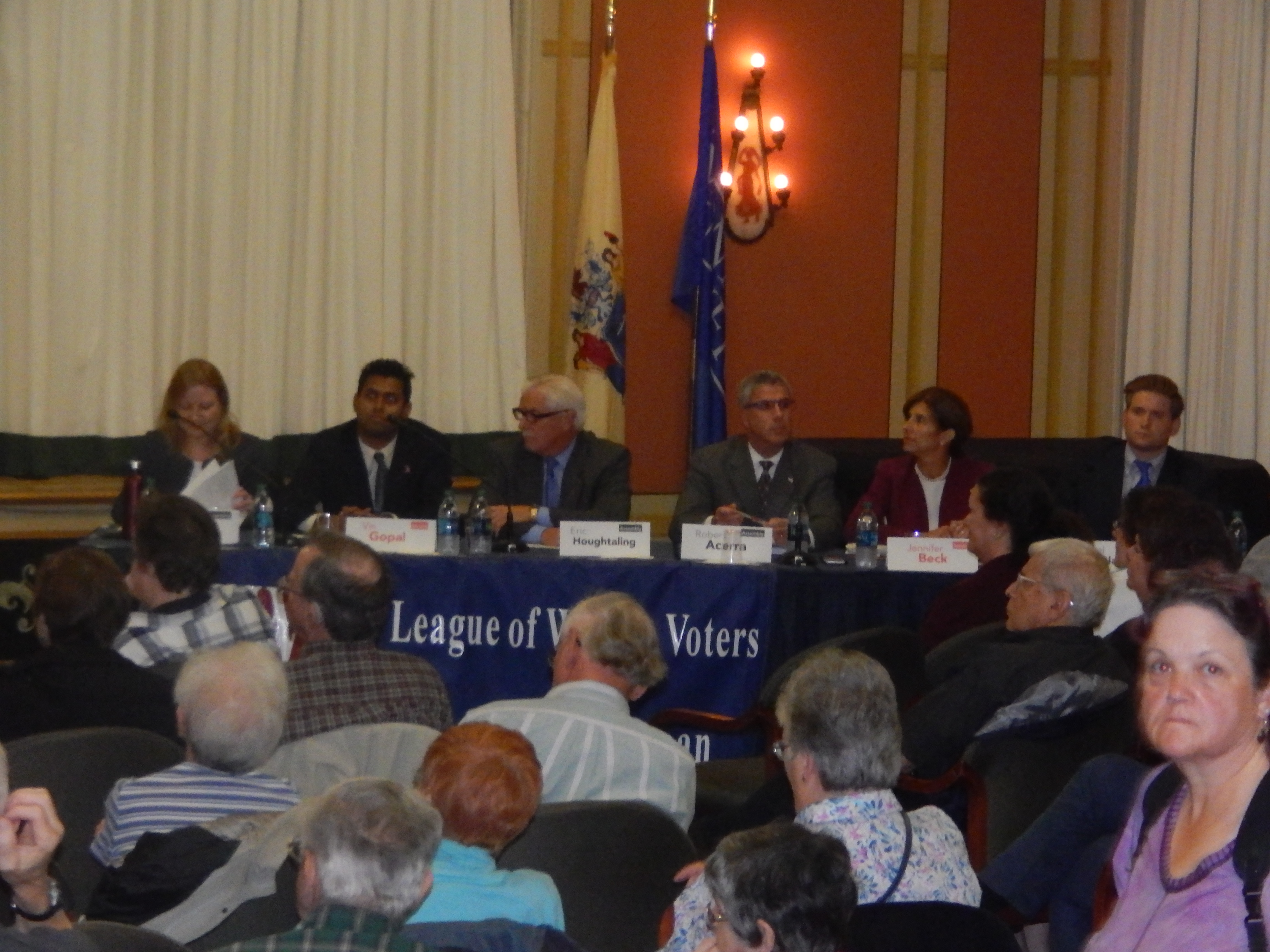 Above the crowd like a hatless cowboy in front of massive saloon doors stood Beck backer Assemblyman (and state senate candidate) Declan O'Scanlon (R-13). Down front in the front row, a repeatedly acknowledged U.S. Rep. Frank Pallone (D-6) sat in Gopal's corner. Monmouth University Pollster and Political Scientist Patrick Murray roamed the crowd. Then the grins thinned in the dimly lit carmine and turquoise-colored room and the League of Women Voters debate began.