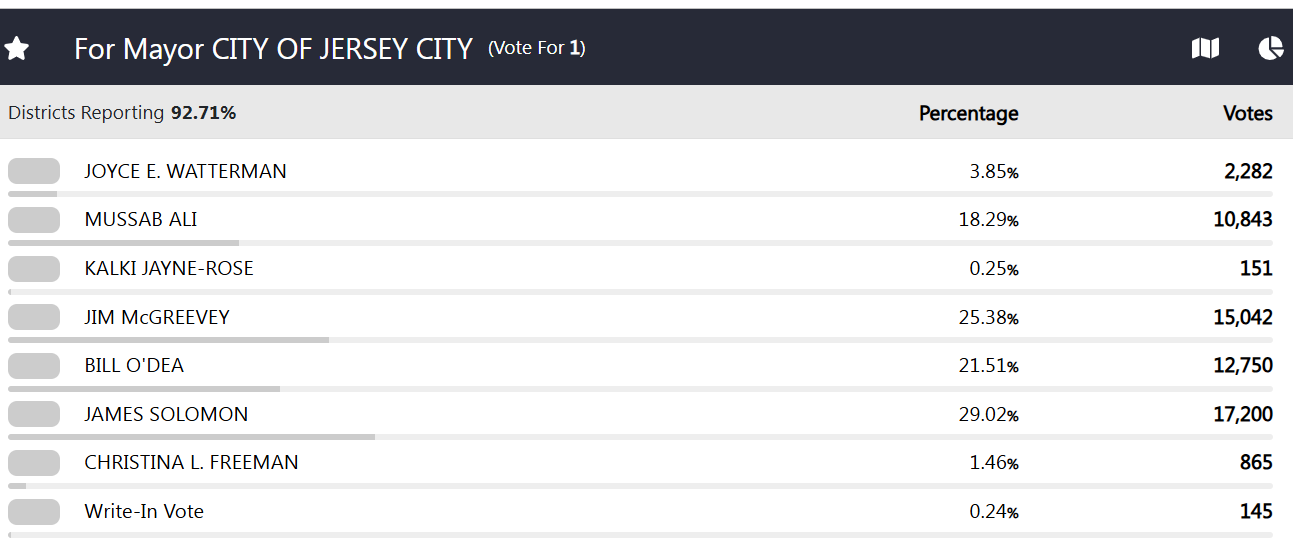 "I would like to congratulate Bill O’Dea, Mussab Ali, Joyce Watterman, Christina Freeman, and Kalki Jayne-Rose who stepped up and made this a race about the future of Jersey City," Solomon added. "This race is better because they ran."