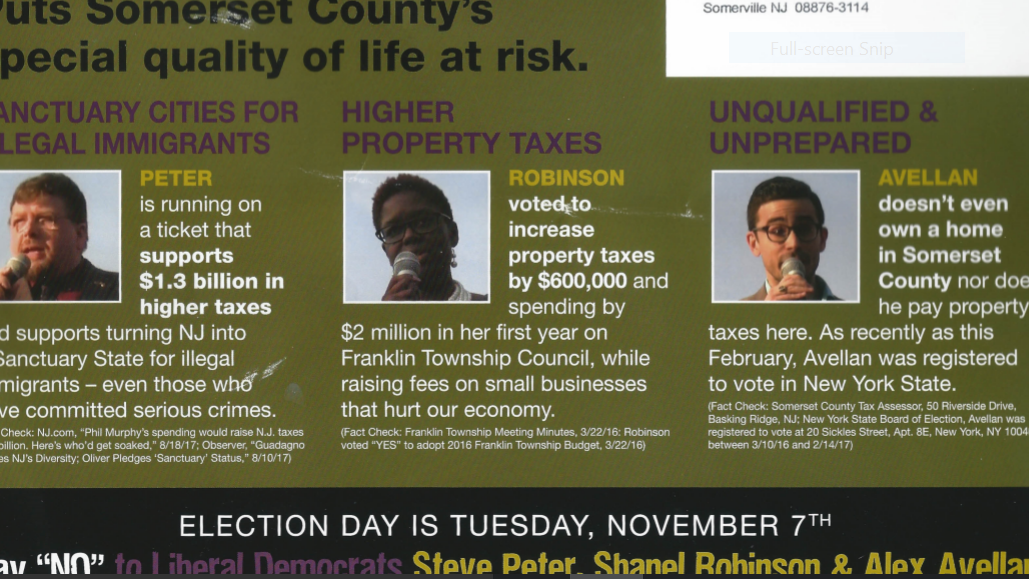 But the GOP - already gleeful over what sources say are missed local organizing efforts by their rivals, is so certain of Murphy missteps that they've accompanied all their conventional pinpointed attacks on individual candidates by fire-hosing a seemingly otherwise guilt-free Democratic Party clerk aspirant. In a mail piece highlighting all three of the Somerset Democrats' countywide candidates, Republicans hit Robinson on a local property tax vote; running mate attorney Alex Avellan, a freeholder hopeful, on a personal residency issue; and Steve Peter, who's challenging Republican Clerk Brett Radi, for running on a Democratic ticket that "supports $1.3 billion in higher taxes and turning New Jersey into a sanctuary state." Apparently, if the piece is to be believed, Peter has a sterling, impeccable record, but squatting under a ticket topped by Murphy automatically jail houses him.