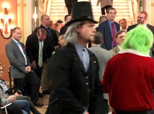 Grinch and Scrooge lined up at the microphone.