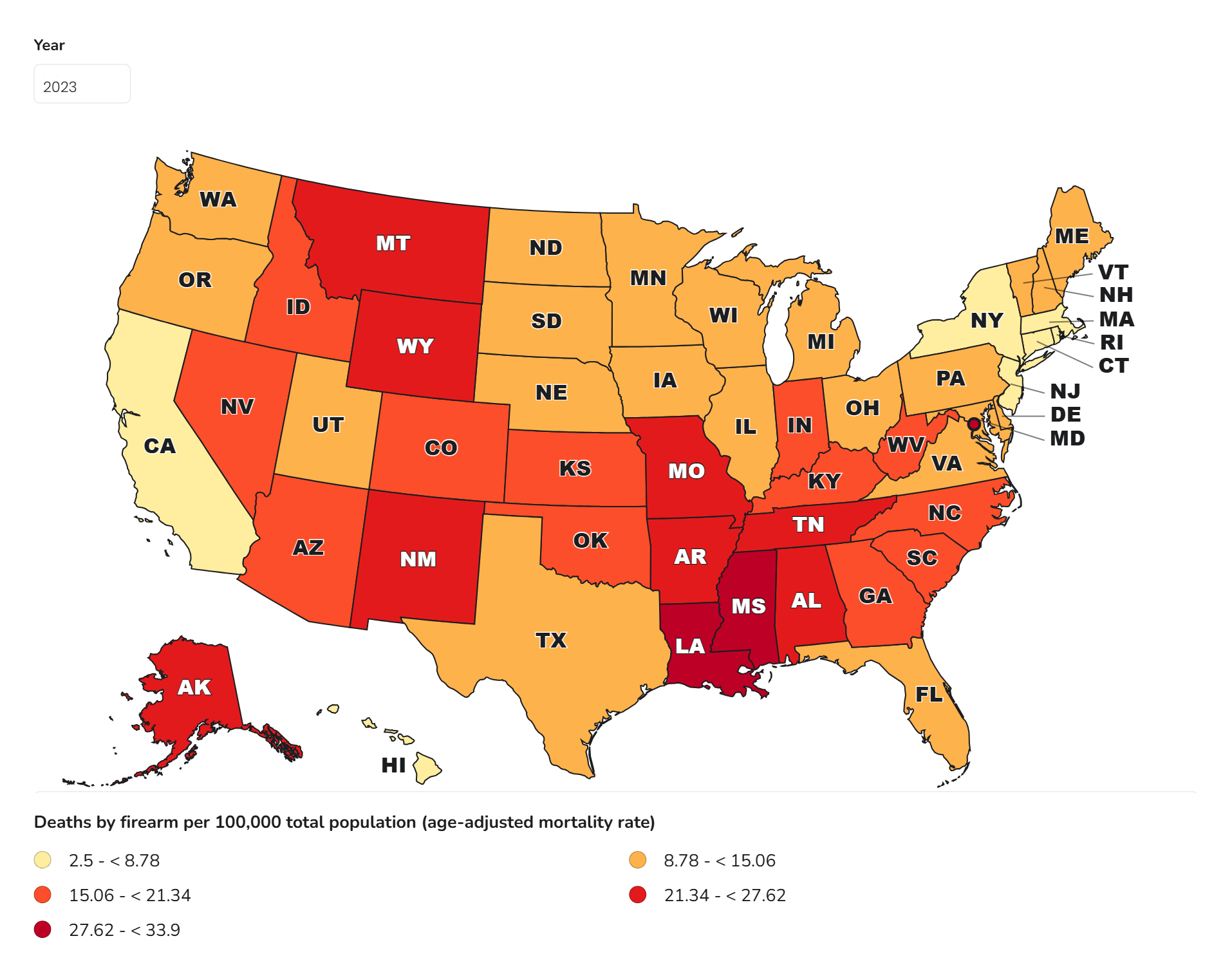 for Trump. 10. Tennessee had a firearm mortality rate of 22.8 and voted for Trump. 11. South Carolina had a firearm mortality rate of 22.4 and voted for Trump. 12. Oklahoma had a firearm mortality rate of 21.2 and voted for Trump. 13. Georgia had a firearm mortality rate of 20.3 and voted for Biden (and Trump over Kamala Harris in 2024). 14. Nevada had a firearm mortality rate of 19.8 and voted