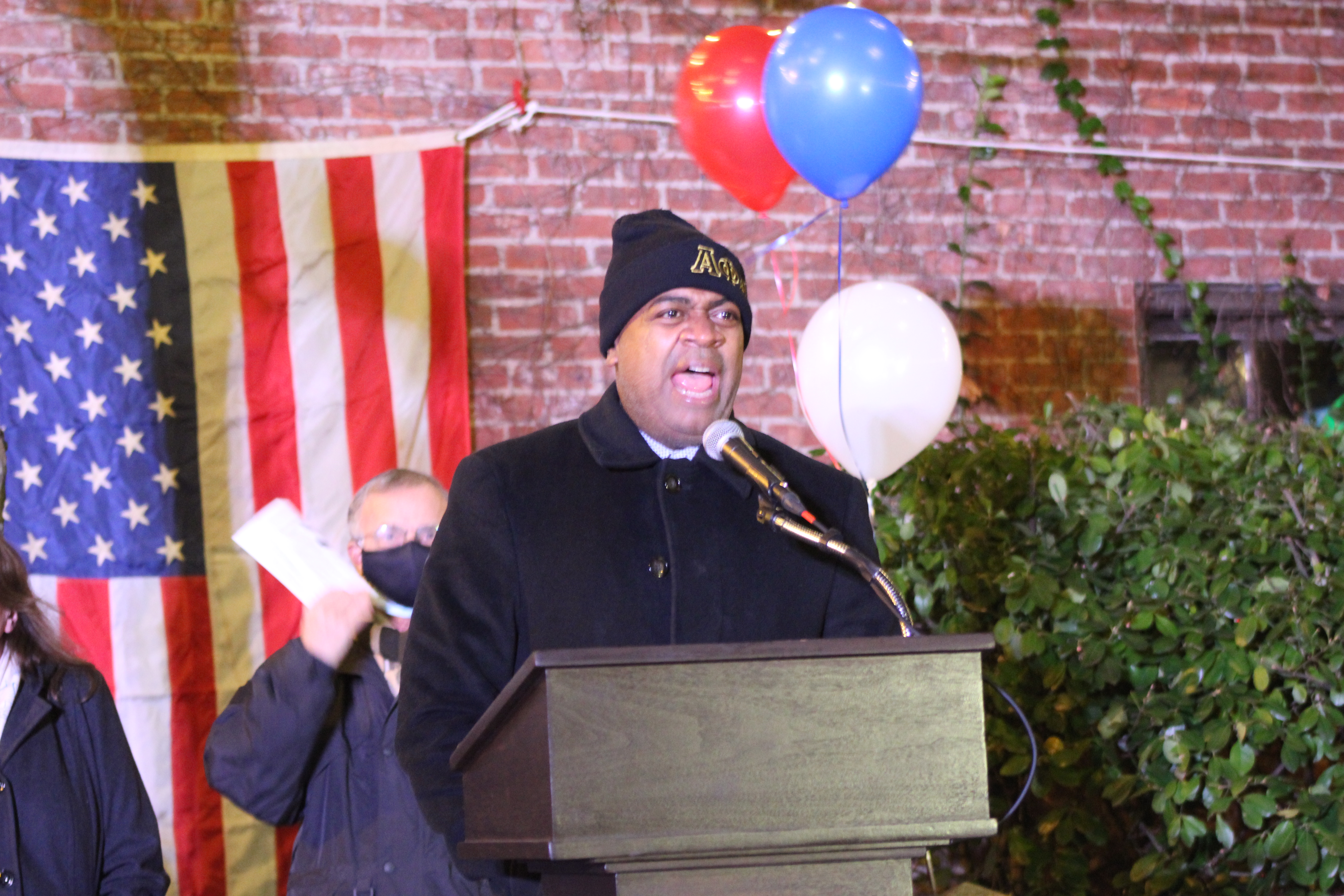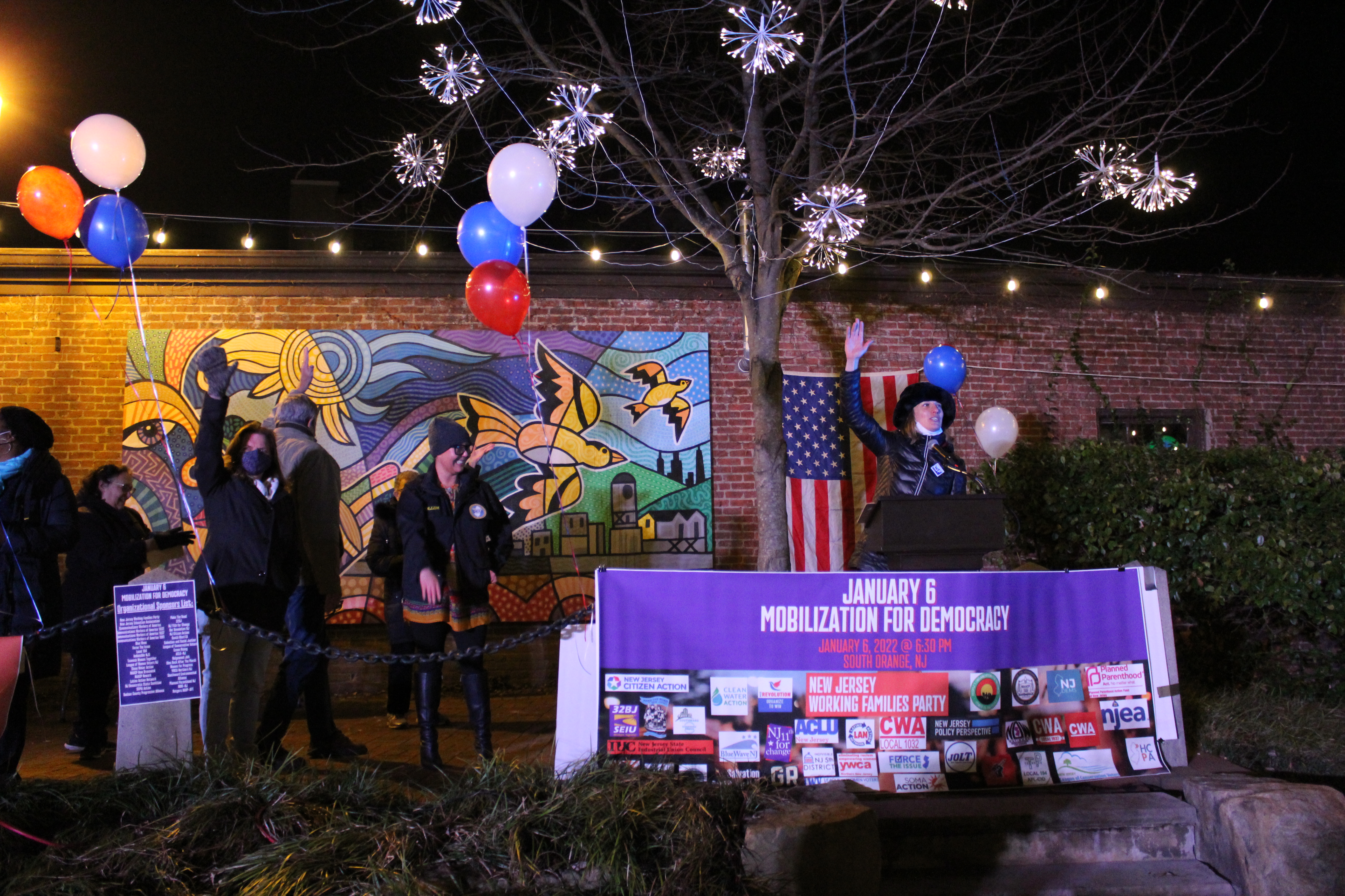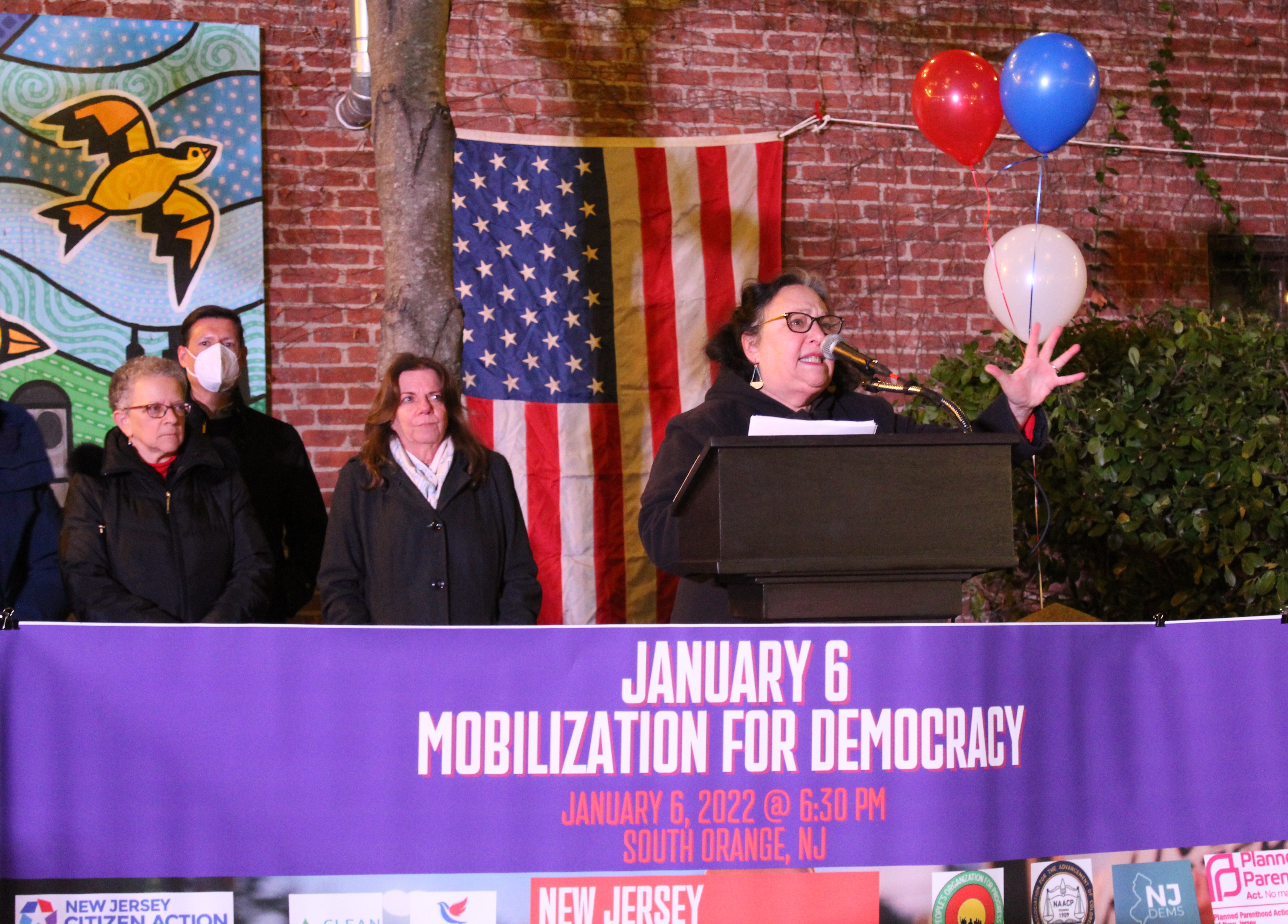 South Orange Village President Sheena C. Collum was brought up by Altman to speak first. Collum’s speech was a slight departure from the purely political and ideological addresses given by the other speakers. She urged everyone to get their vaccinations and booster shots as a necessary component of their work to stem the tide of authoritarianism in the United States. “Tonight we're mobilizing for democracy, but in order to protect democracy, we need to protect ourselves and each other and what I'm talking about is the vaccination and the booster,” Collum said. “When we came together here in Spiotta Park in November to get out the vote for Phil Murphy, in line A, we talked about how we had 90% vaccination rates in South Orange and Maplewood. Yet, unfortunately, since that time, we have not been immune to the increase in COVID-19 positive cases and specifically the Omicron variant in the past month.”