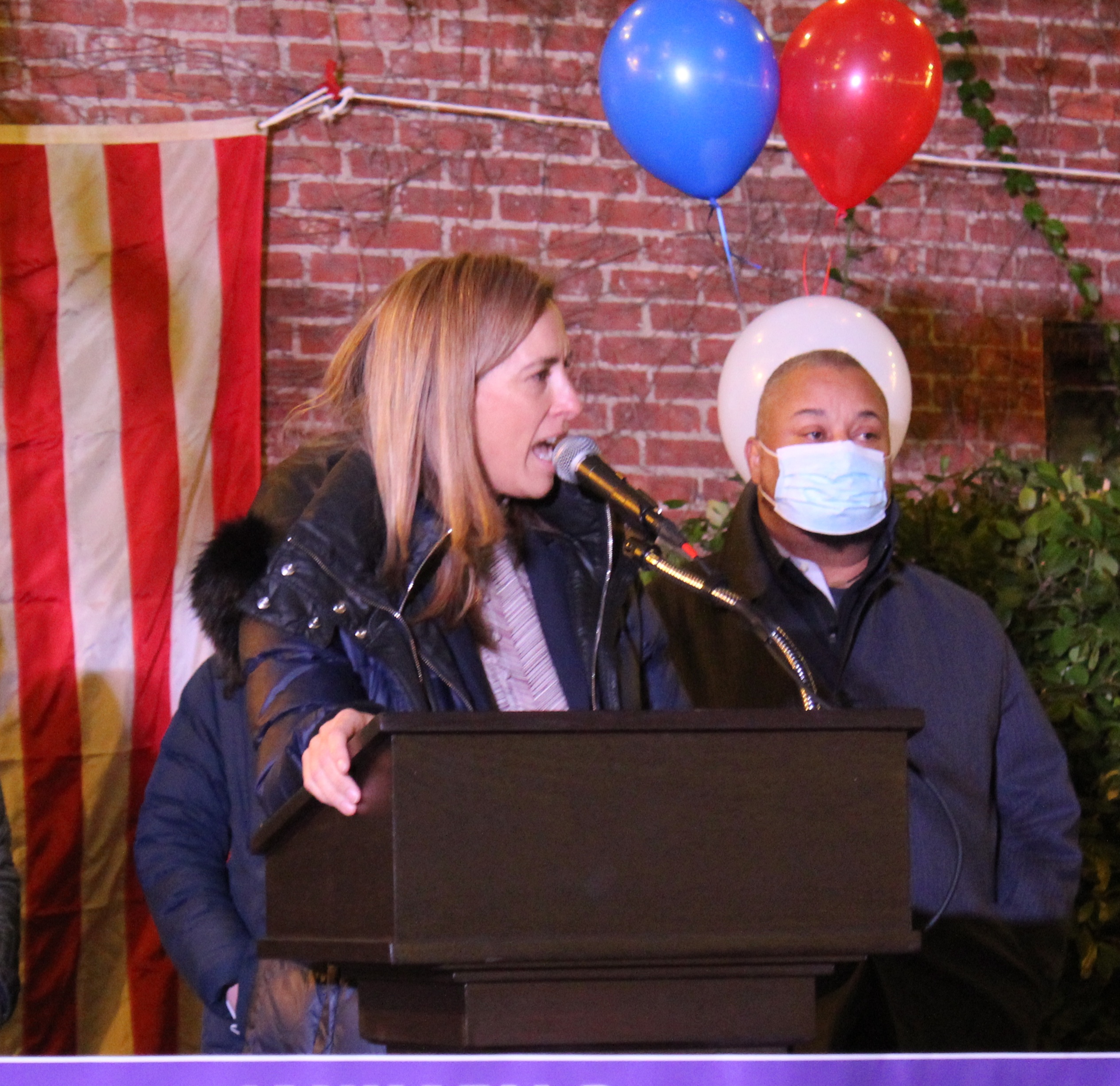 Congresswoman Mikie Sherrill arrived as Hamm was finishing his speech and was the last speaker for the event. Sherrill, a veteran Navy helicopter pilot, recounted her experience during the Capitol attack, hunkered down and clutching a gas mask in one hand and her cell phone in the other. “I remember so clearly, because I had two distinct thoughts in my head a year ago. One was, I can't believe this is happening. I can't believe I'm in the chamber of the United States House of Representatives, pinned down by an angry mob of Americans attacking our capitol building and sent by the President of the United States, I can't believe this is happening to me. Then there was that other side of me, maybe the more cynical side of me, maybe some people might even say, The Jersey Side of me. That side would say, I knew that this was going to happen. I knew it. [Trump] was saying he wasn't going to turn over power. We were seeing the militias, the Proud Boys, the Boogaloo Boys, we were seeing what was happening in this country. And as I stand here a year from that day, we still have these two separate paths laid out before us. This path of cynicism, this path of division, this path where we lose faith, faith in our democracy, in our country, and our values and our freedom. But then we have the other path. For so many reasons, including all of you who I see here tonight, I know which path this country is taking and which path this country is on. There are too many of us who, for over 200 years, have fought too hard for what we believe in.”