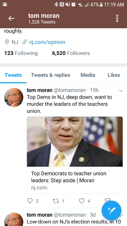 We demand an immediate public apology from both Tom Moran and the Star-Ledger over a tweet by Moran referring to the desire of some prominent but unnamed Democratic officials to murder NJEA’s leaders. The tweet, “Top Dems in NJ, deep down, want to murder the leaders of the teachers union,” was posted by Moran to promote an article he had written calling for the removal of NJEA’s leaders in the wake of the 2017 election.