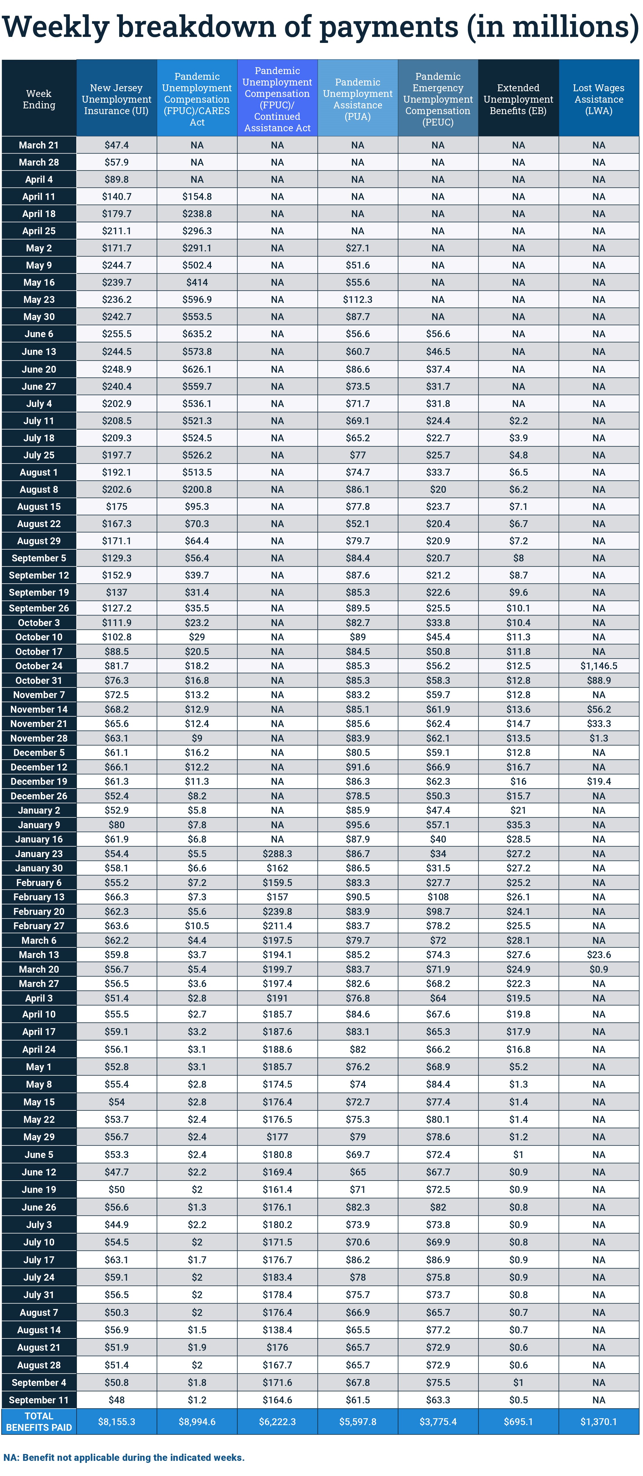 Here is the breakdown of weekly benefits payments to eligible New Jersey workers: